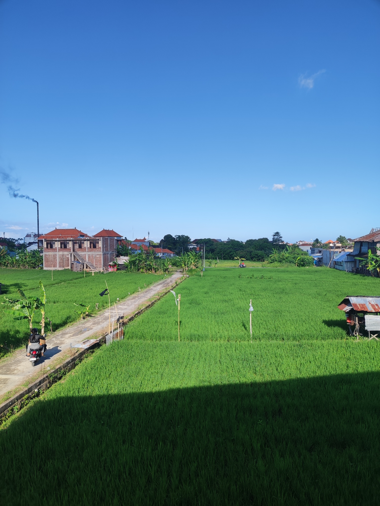 The image shows a vibrant green rice paddy field in North Kuta, Indonesia. A narrow concrete path bisects the field, leading towards buildings in the distance. A brick structure with a red tile roof a…read more