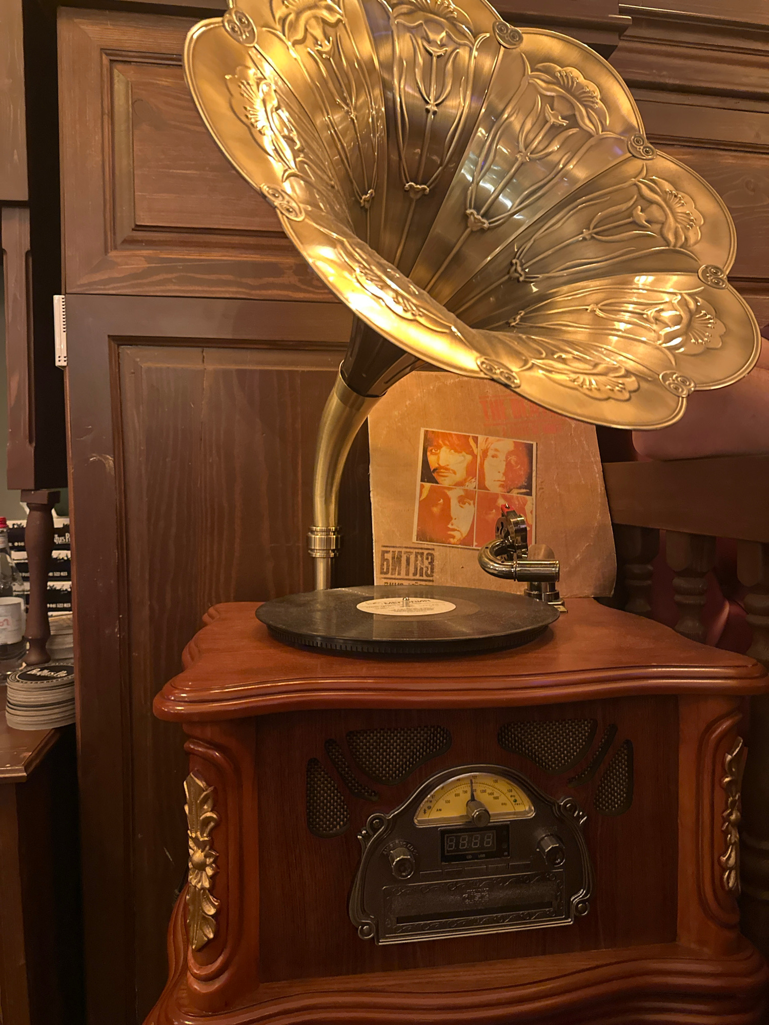A top-down view shows an antique phonograph with a large, ornate gold horn. A vinyl record sits on the turntable, next to a record cover with four faces printed on it in a 2x2 grid. The phonograph's b…read more