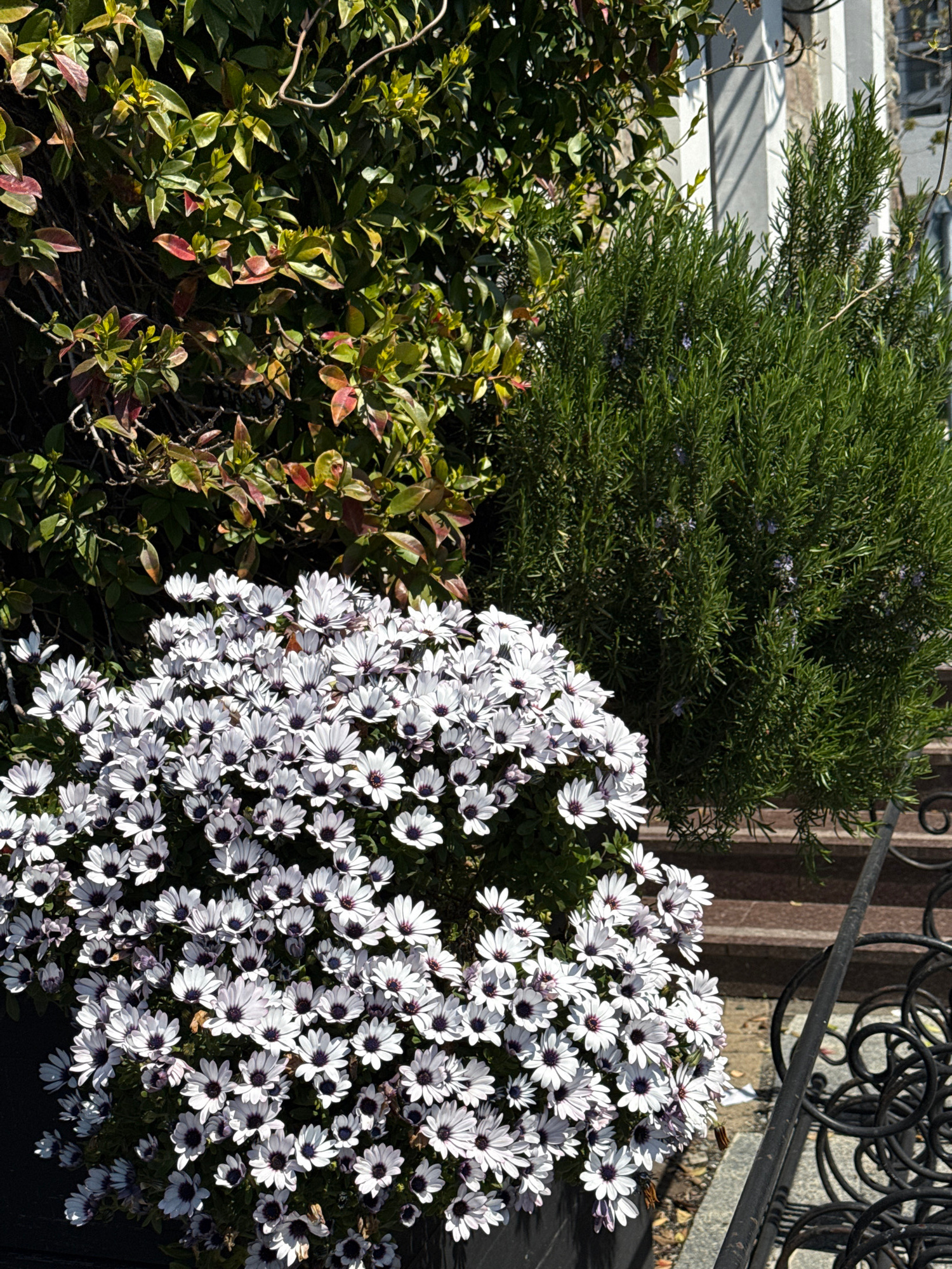 The image captures a sunlit garden scene in Sochi, Russia, featuring a vibrant array of plants. In the upper left and center, a large, bushy Rosemary plant with abundant narrow, dark green leaves and…read more