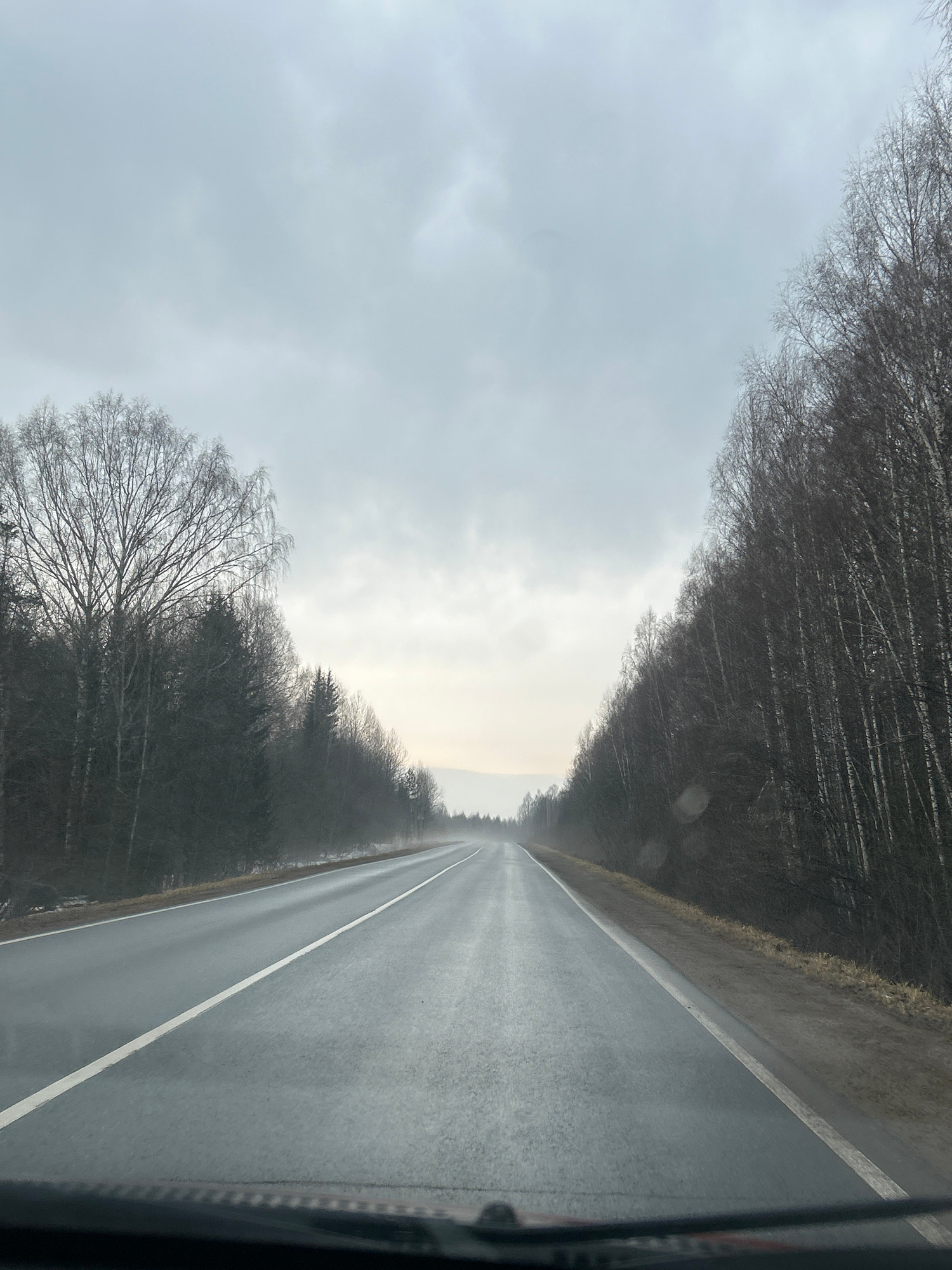 The image depicts a straight asphalt road bisecting a landscape characterized by bare trees and an overcast sky. The road, marked with a white line, appears wet, reflecting the ambient light. The tree…read more