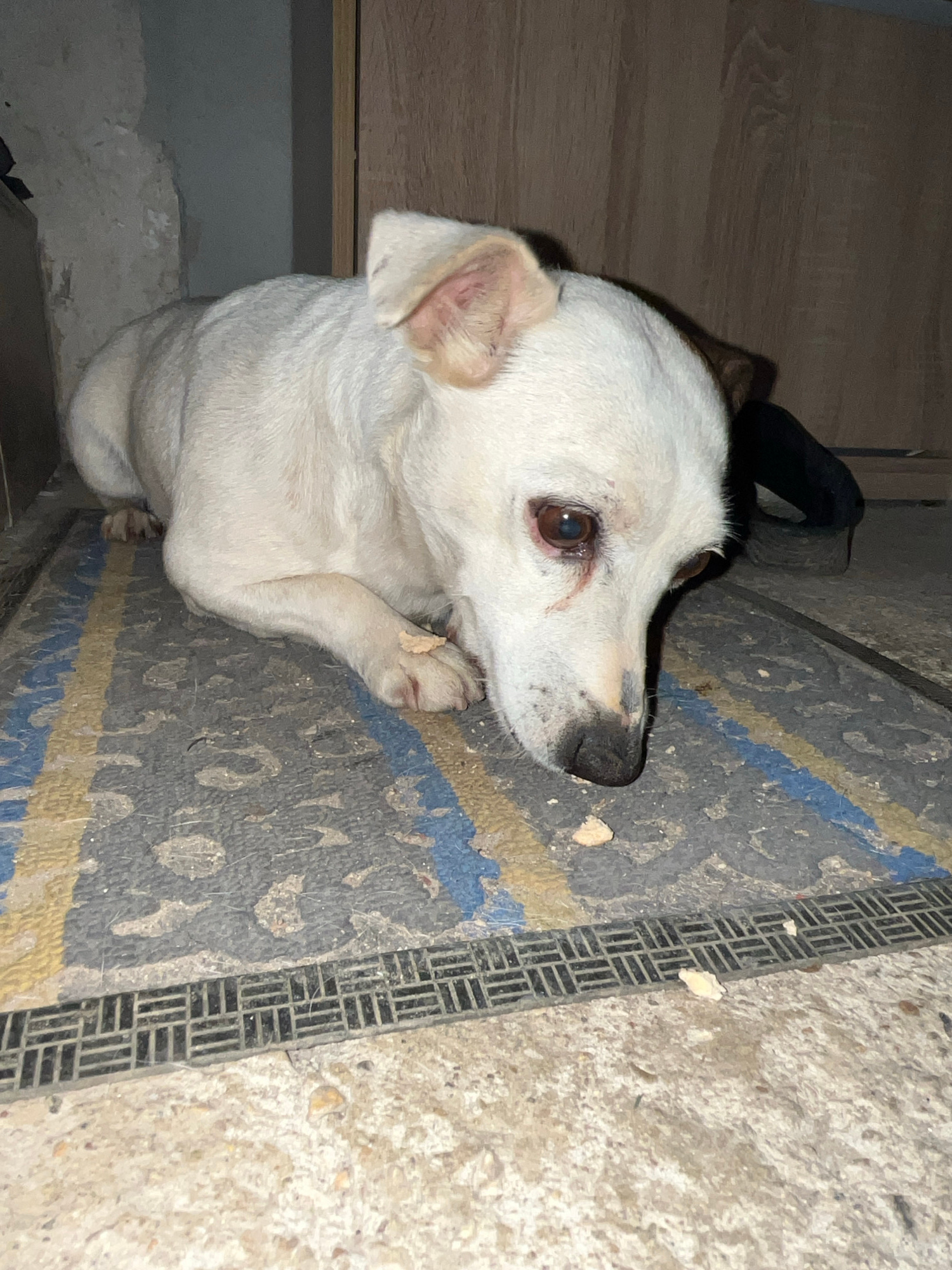 A white dog with brown ears and a black patch on its head is sitting on a patterned rug. The dog is looking upwards towards a small, light-colored piece of food on the rug. The rug is grey with blue a…read more