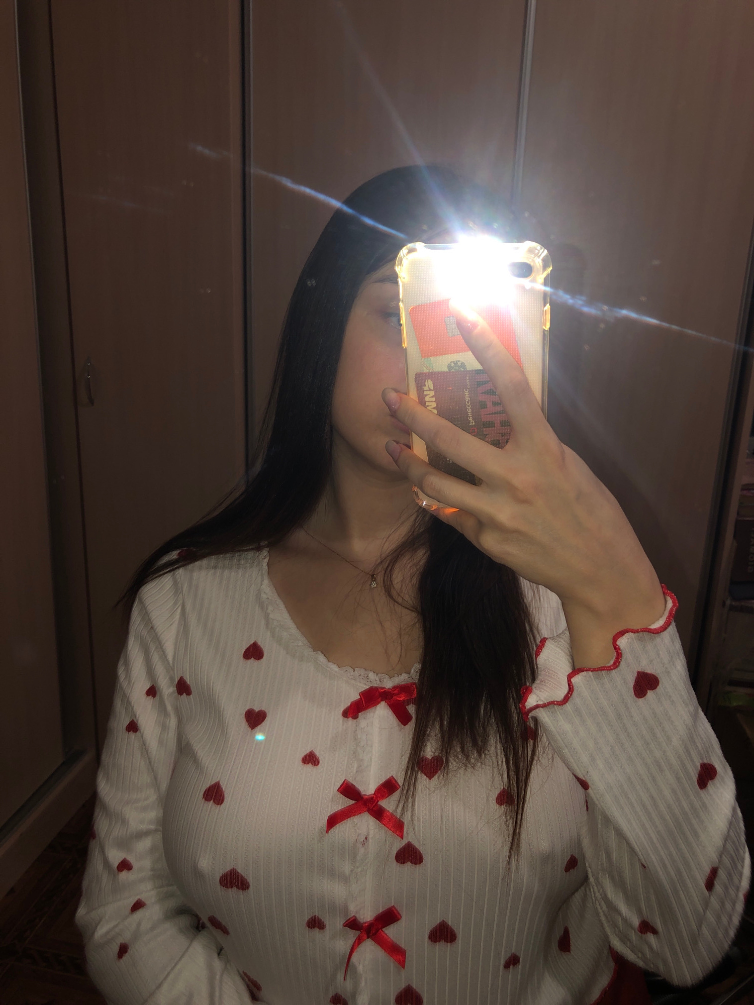 A selfie taken by a person facing left, wearing a white, long-sleeved shirt adorned with red hearts and red ribbons, and holding a phone with a bright flash. The background appears to be a mirrored su…read more