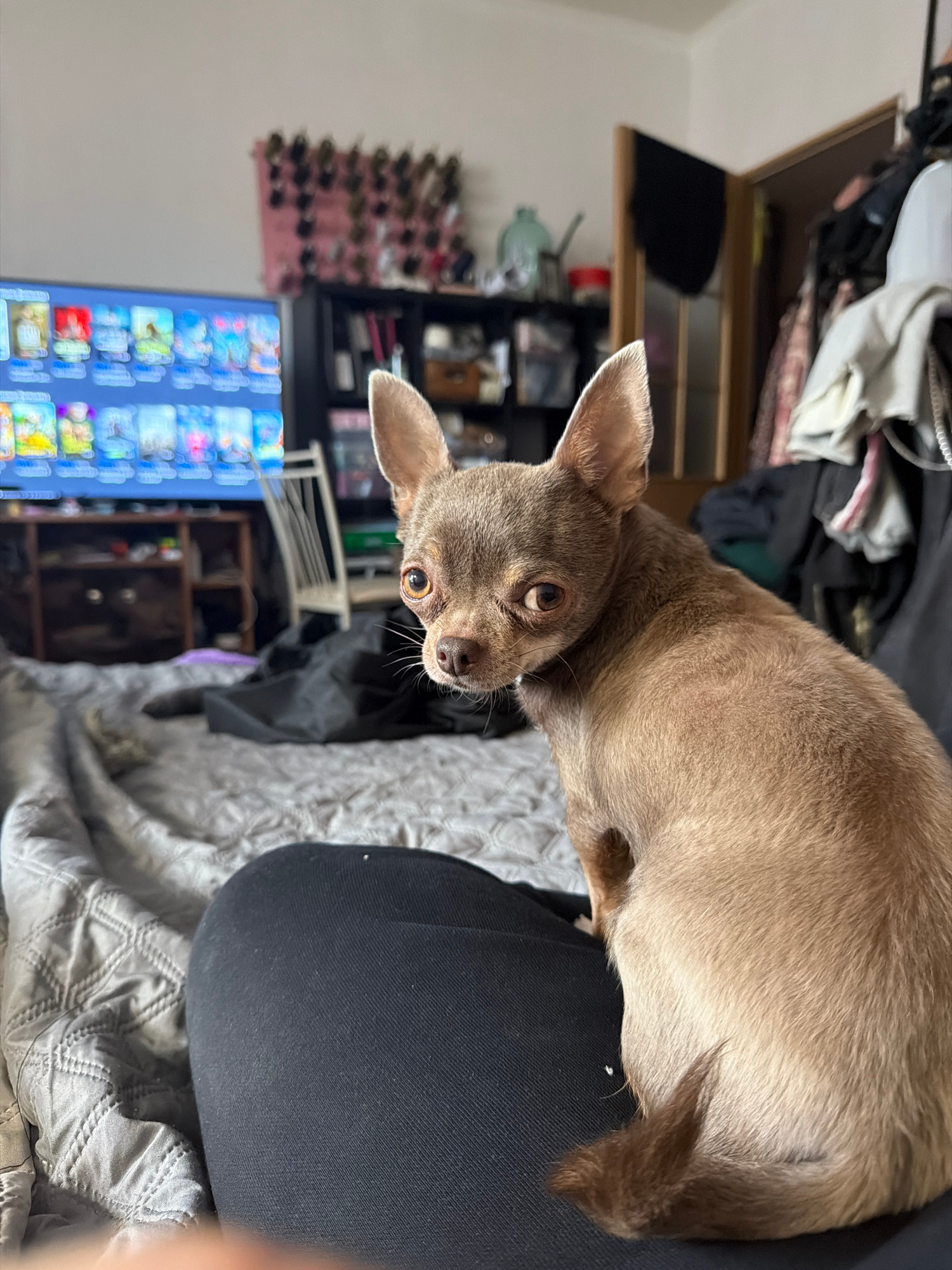 A brown Chihuahua with large ears sits on a person's lap, looking at the camera. The person wears black clothing and sits on a gray patterned bedspread. In the background, a television displays images…read more