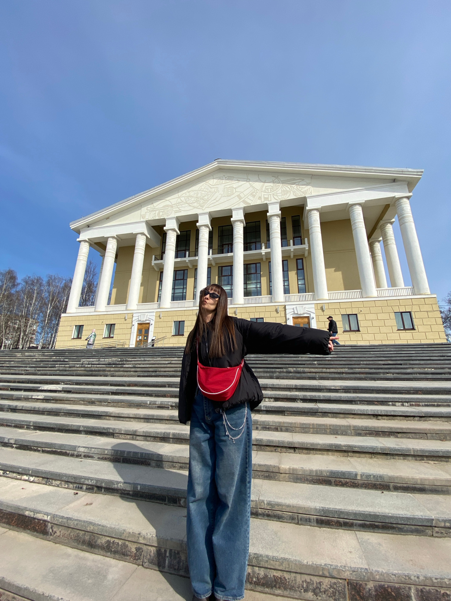 A young woman stands on a wide set of concrete stairs in front of the Votkinsk Palace of Culture in Votkinsk, Russia. She is wearing a black jacket, blue jeans, and a red shoulder bag. She is also wea…read more