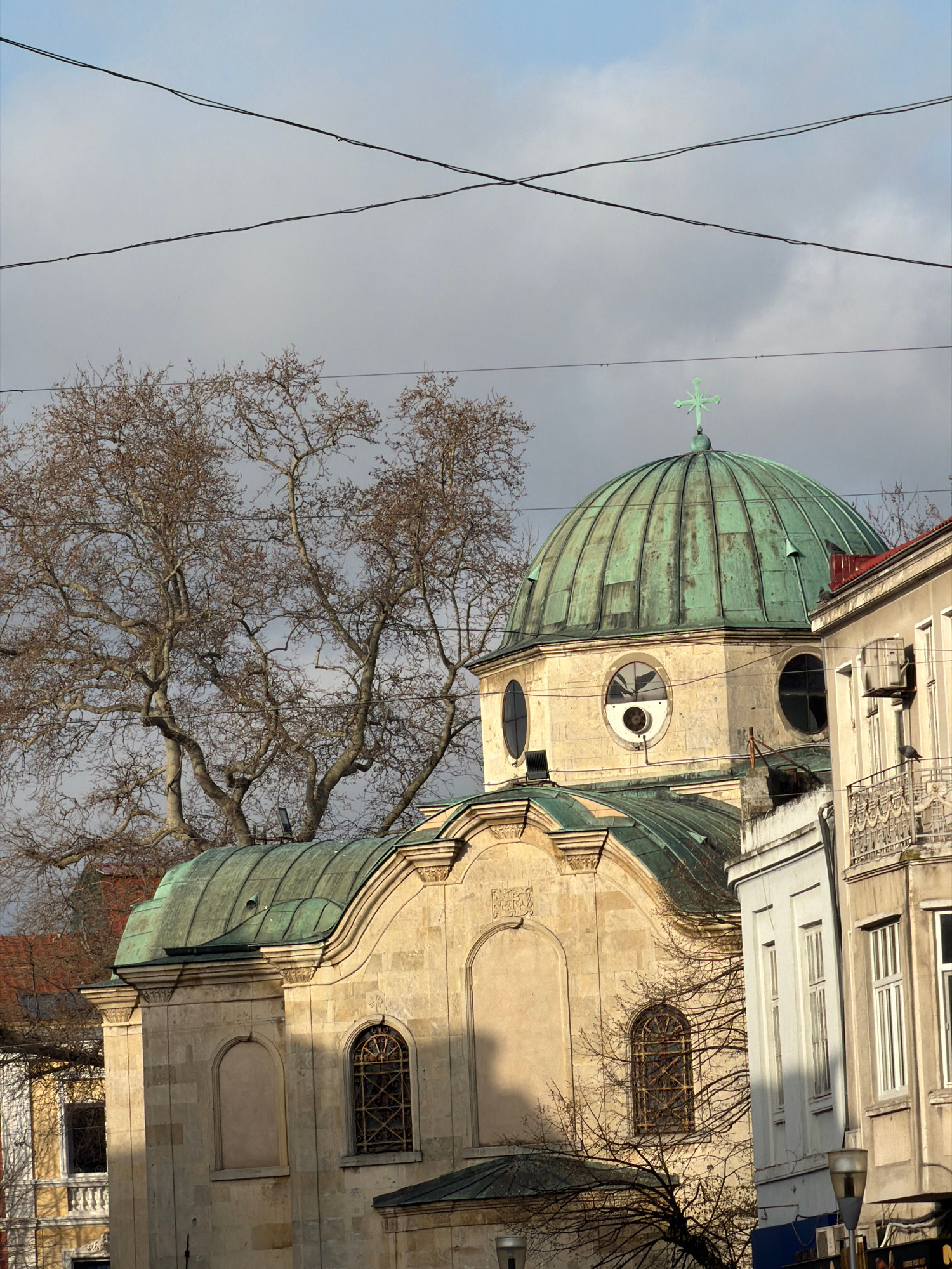 The image shows the dome and part of the facade of the Dormition of the Mother of God Cathedral in Varna, Bulgaria. The dome is green with a cross on top. A large bare tree is in front of the building…read more