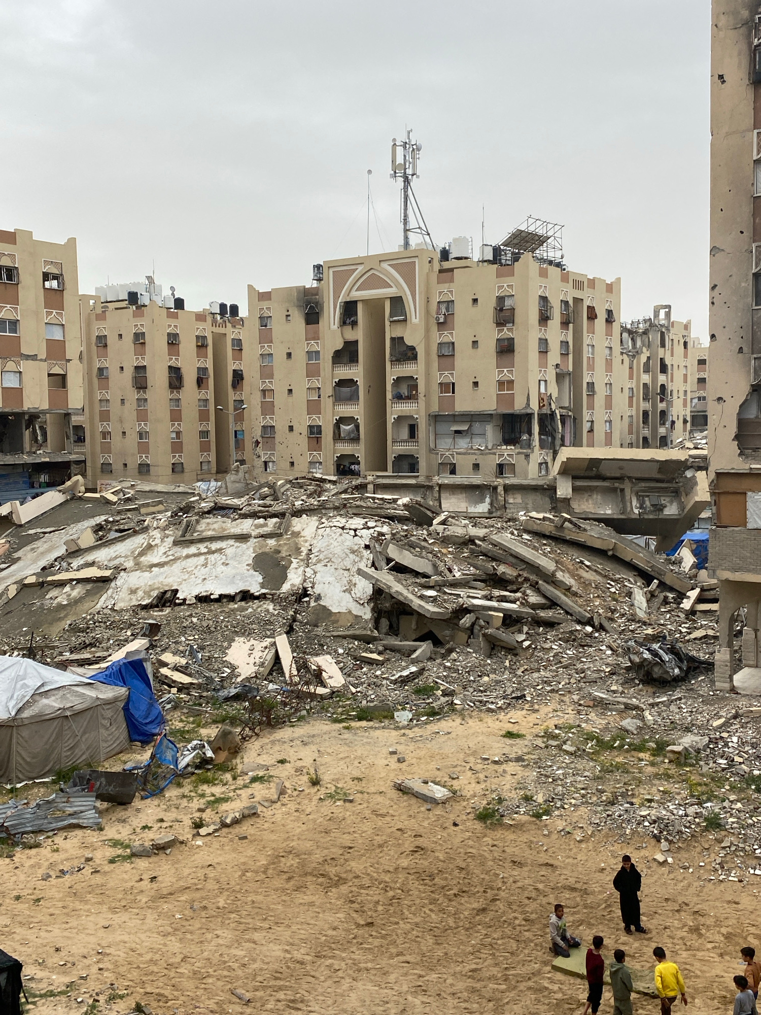 The image depicts a scene of devastation in Khan Yunis, Palestinian Territory. Several multi-story buildings stand, with one partially collapsed into a pile of rubble. The rubble consists of concrete…read more