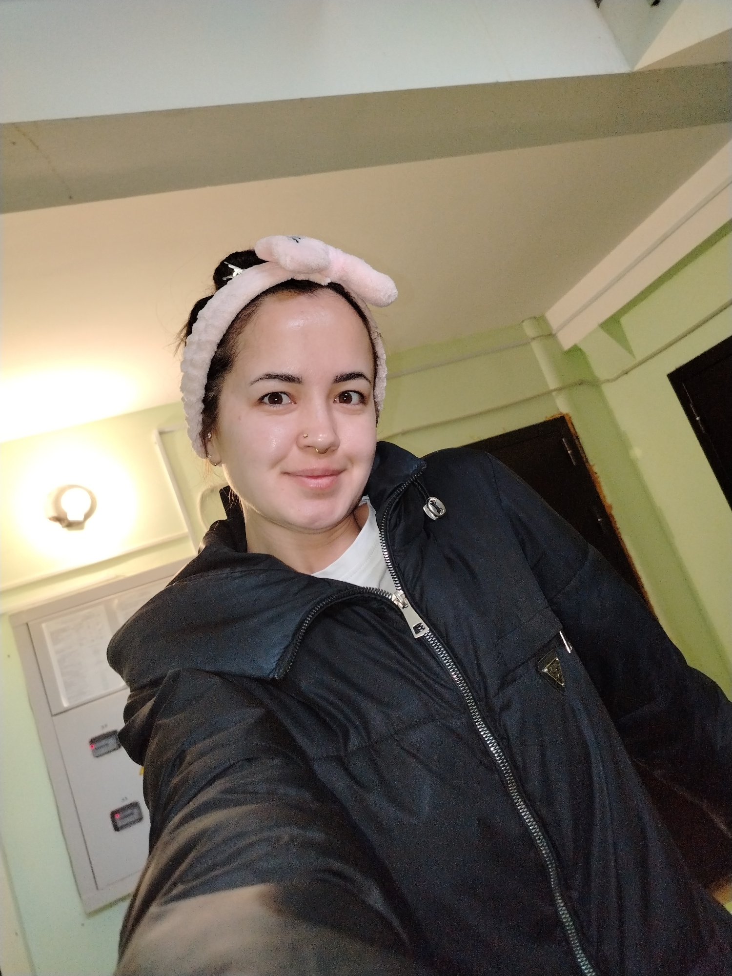A woman is depicted in a close-up, indoor selfie, looking directly at the camera with a faint smile. She has dark hair pulled back with a soft, pink, bunny-ear headband. She wears a silver nose ring aβ¦read more