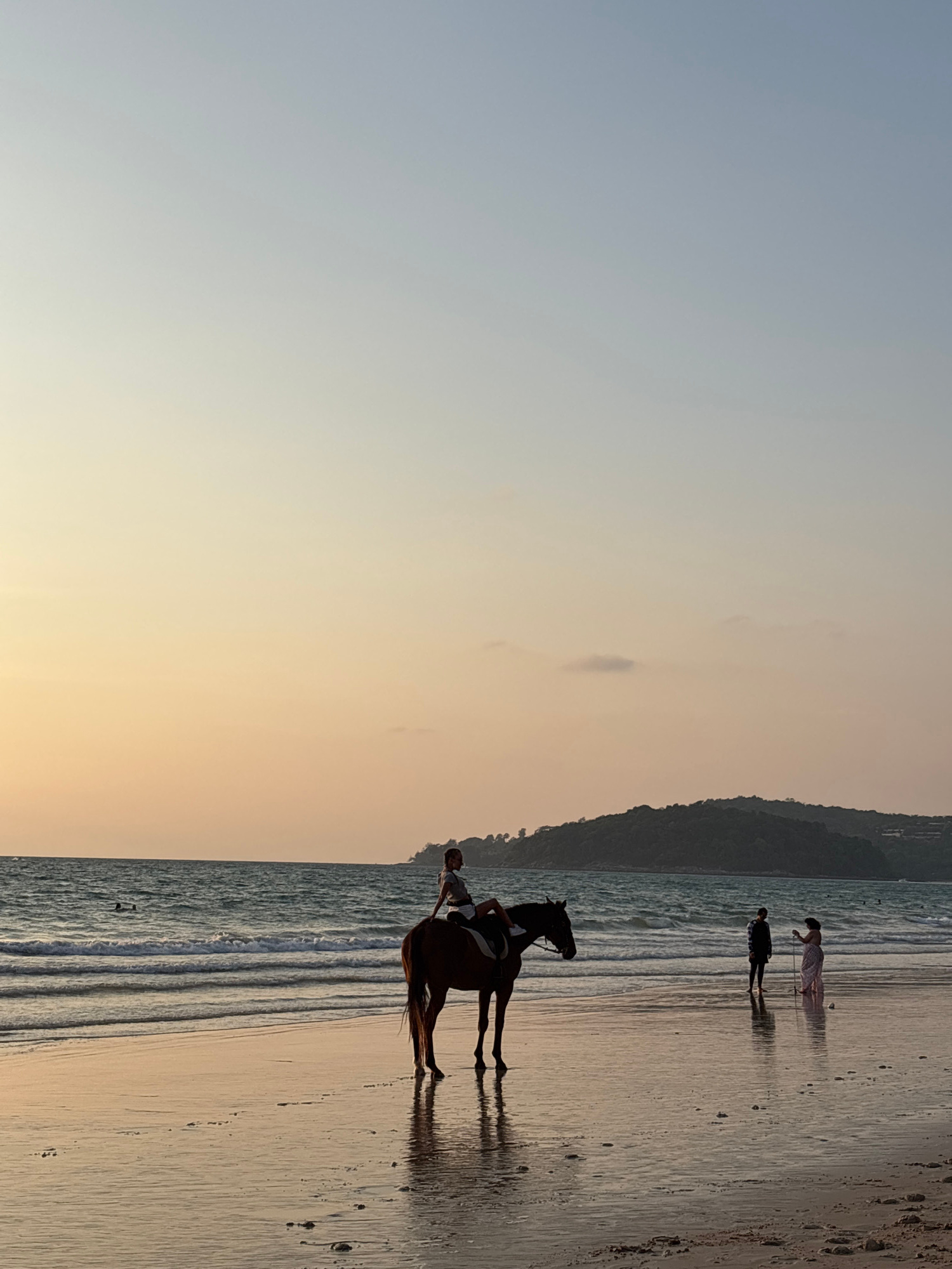 A horse and rider gallop on Bang Tao Beach in Choeng Thale, Thailand, at sunset. The scene includes two other individuals wading in the water behind them. A hillside with foliage is visible in the bac…read more