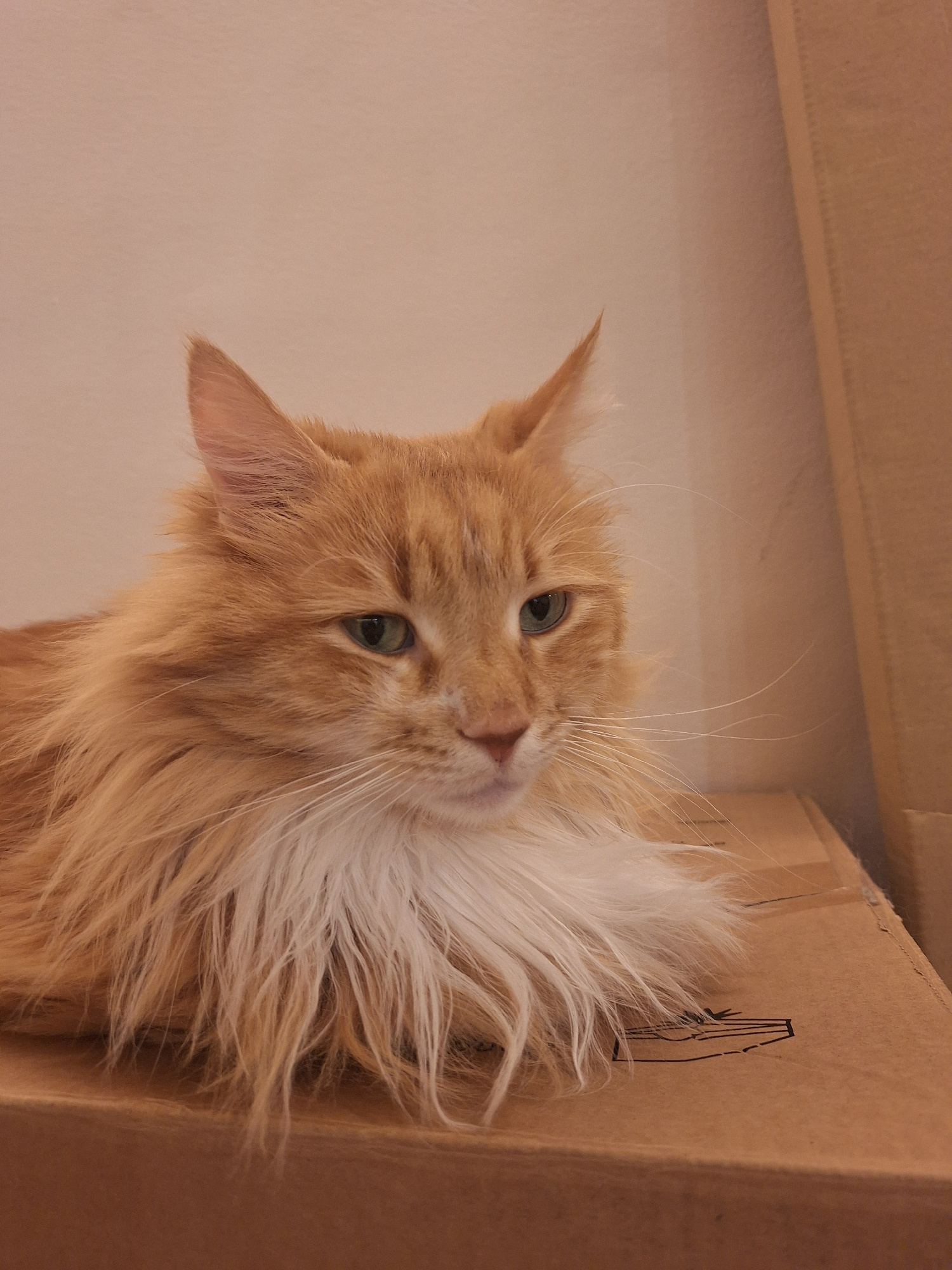 A close-up, indoor shot depicts an orange cat with long fur, likely a Maine Coon, tilted towards the camera. The cat's face is prominent, displaying green eyes and long white whiskers. Part of the cat…read more