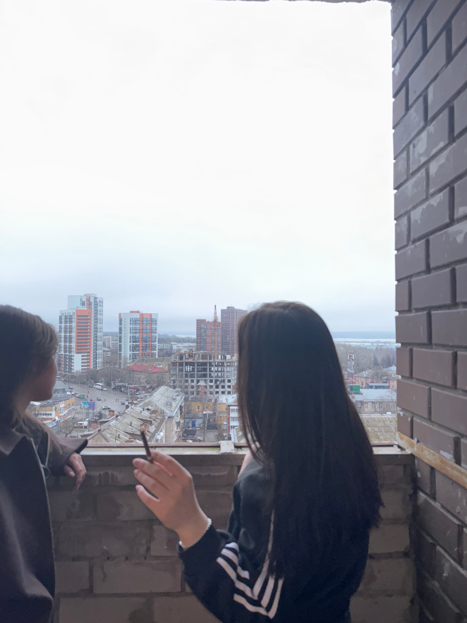 An eye-level shot from an unfinished building in Perm, Russia, capturing two individuals. One person, mostly obscured except for their head and shoulders, is dressed in brown clothing. The other is we…read more