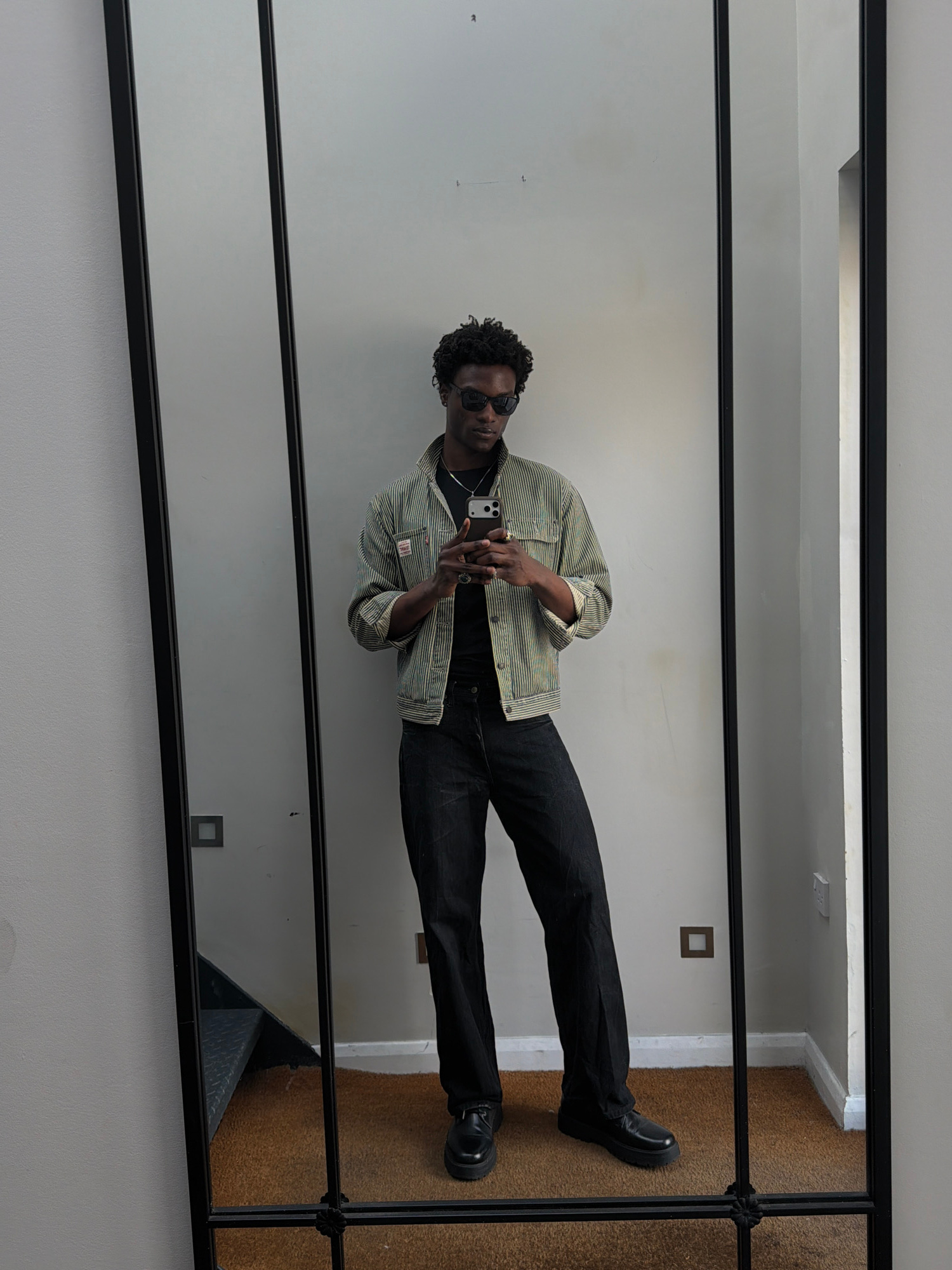 A person, likely male, is captured in a full-length mirror selfie, positioned centrally within the frame which is rotated 90 degrees counter-clockwise. The individual has dark, curly hair and is weari…read more