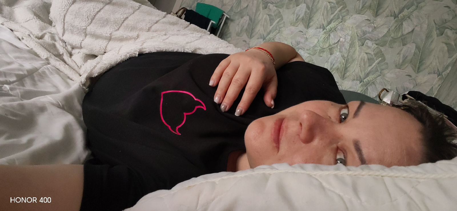 A person is lying in bed under blankets, with a black shirt with a pink logo visible. The background includes a wall with a plant leaf pattern. There is no evidence to suggest this image was taken in…read more
