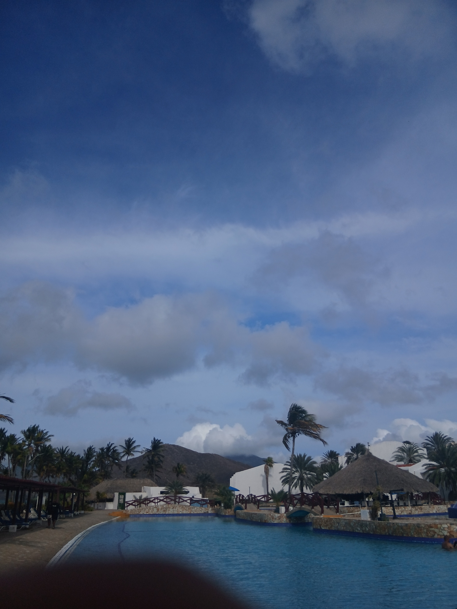 The image shows a swimming pool area in Altagracia, Venezuela. The pool is turquoise blue and runs along the right side of the frame. Palm trees line the side of the pool, with some thatched-roof stru…read more