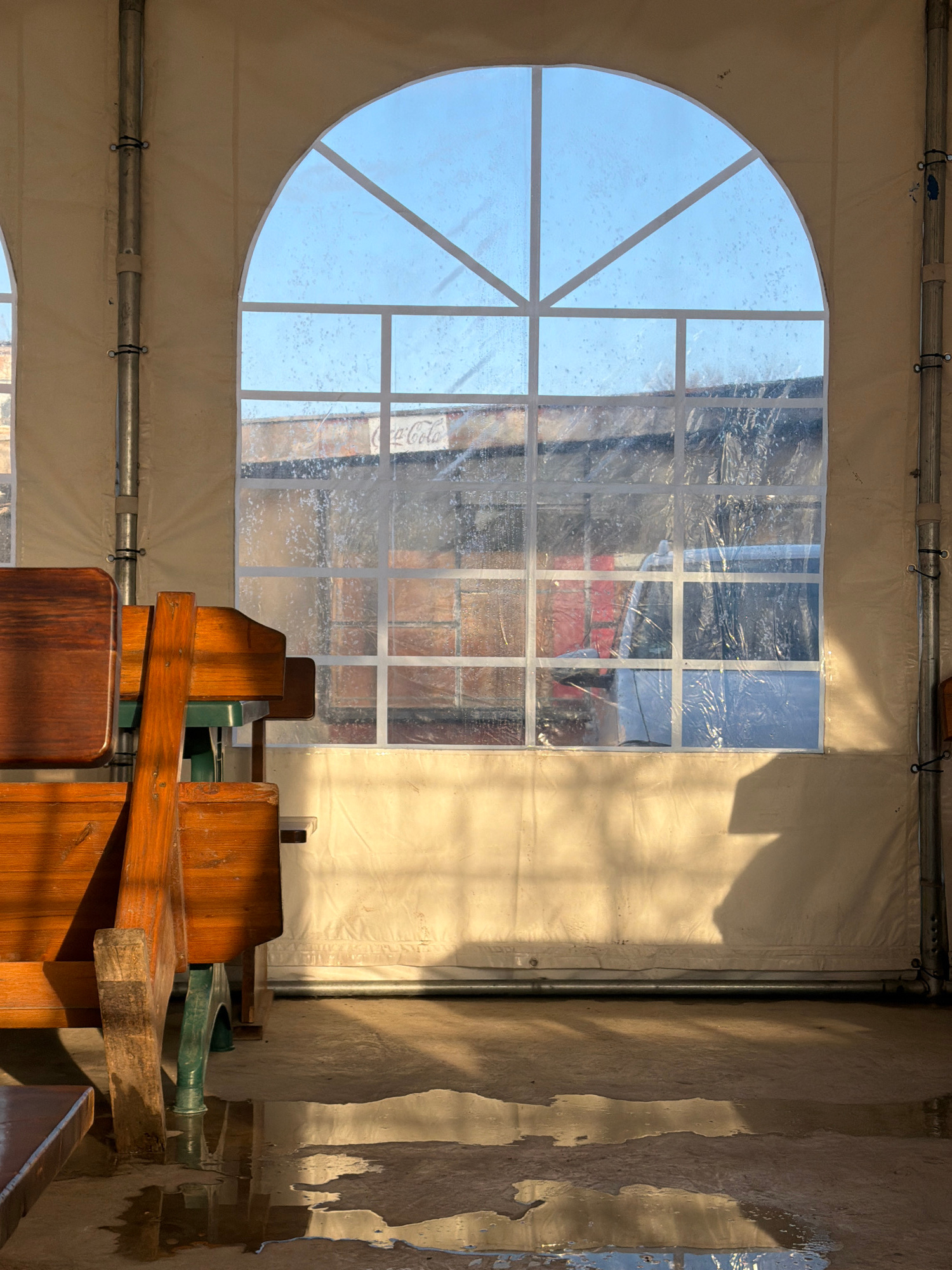The image depicts an interior scene, likely within a temporary structure, perhaps a tent. The predominant feature is a multi-paned window composed of both rectangular and semi-circular sections, frami…read more