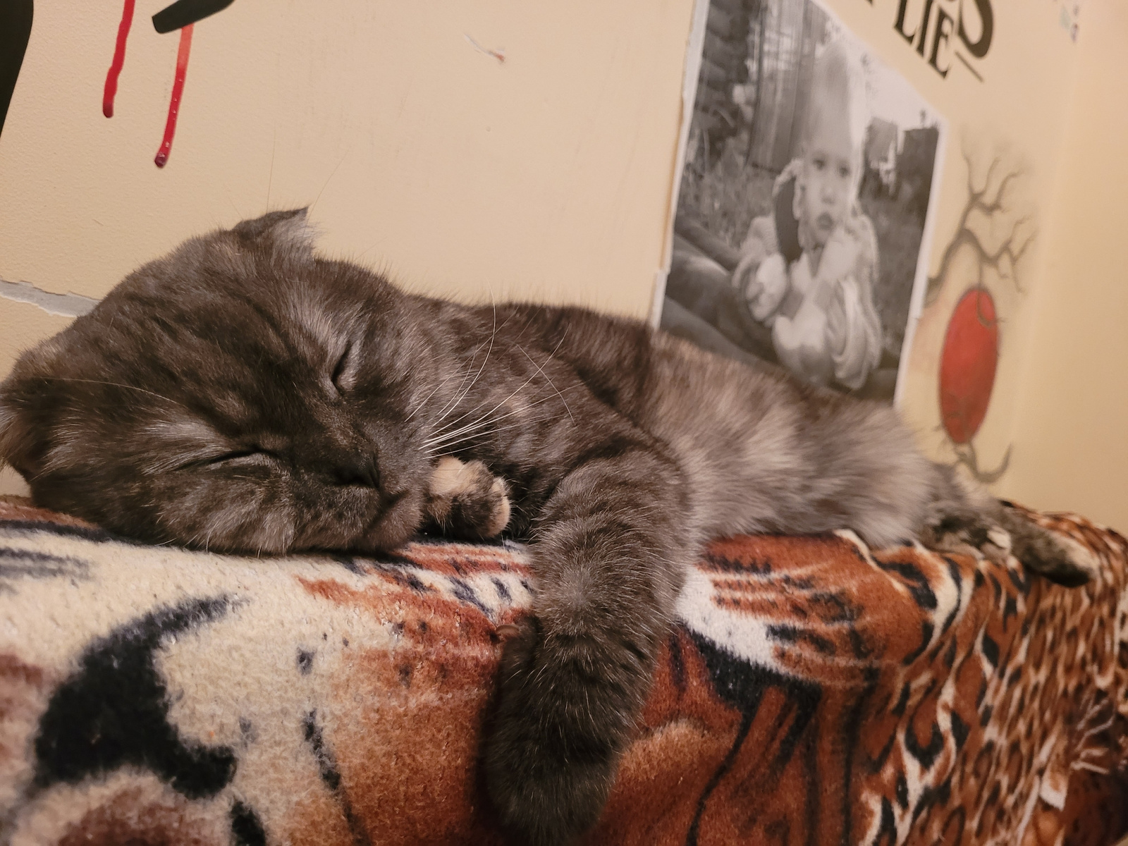 A gray tabby cat is sleeping on a tiger-striped blanket. The cat is curled up with its tail near its face. A wall with a poster and some decorative paint is visible behind the cat and blanket. It is nโฆread more