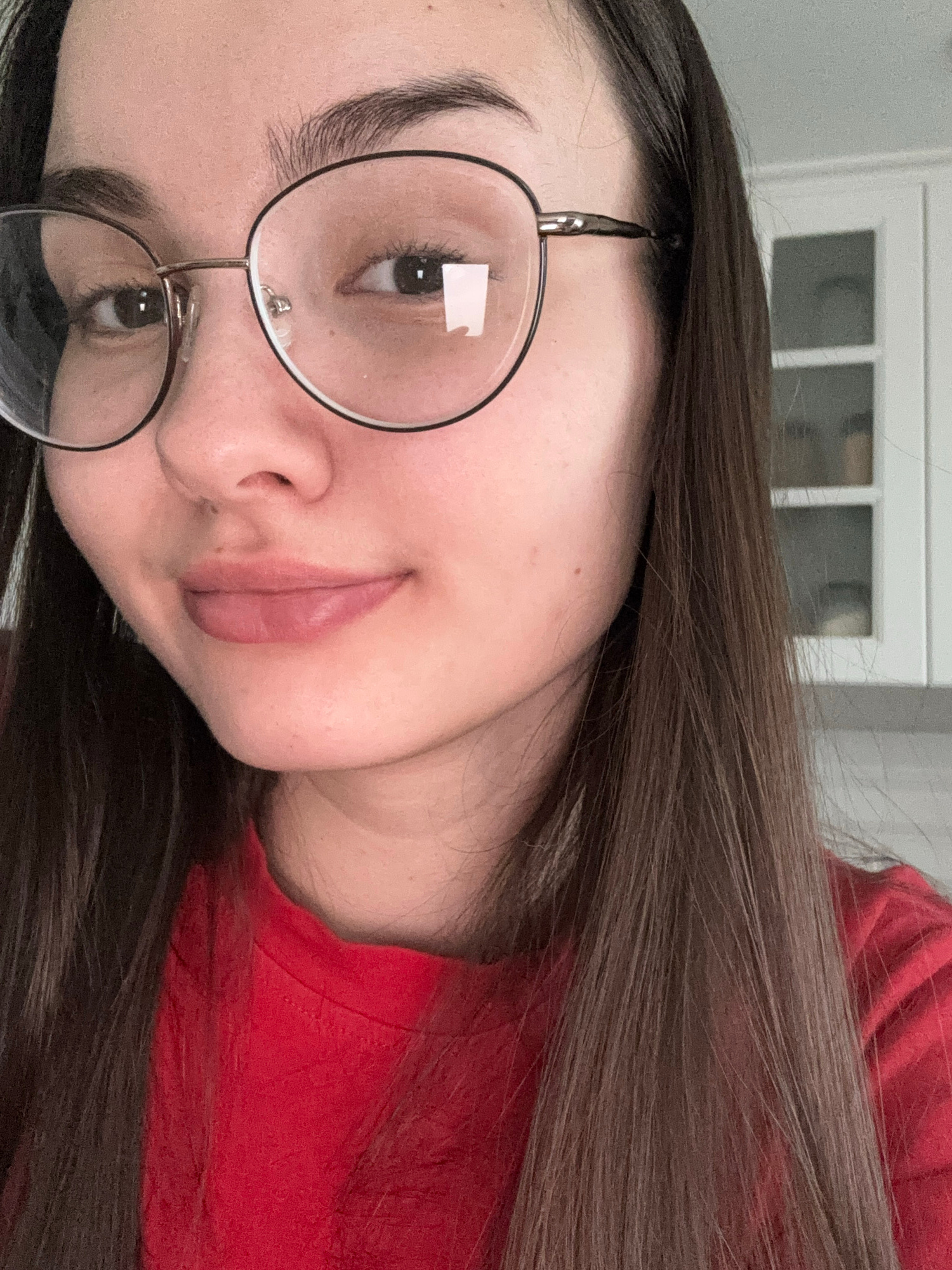 A close-up, angled headshot of a woman with long, straight dark brown hair and light skin. She is wearing round, thin-rimmed glasses. Her expression is neutral with slightly pursed lips. She is wearin…read more