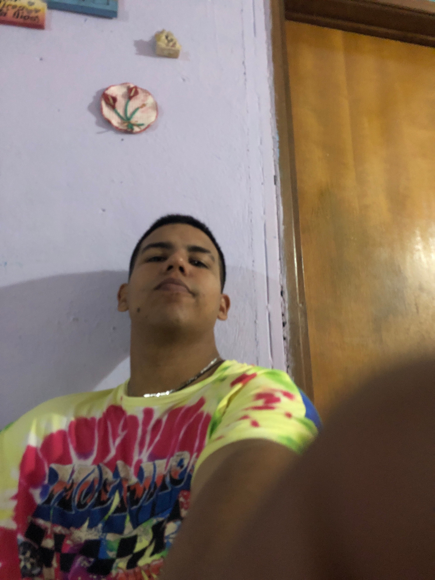 A young man with short dark hair and light brown skin is shown from the chest up, wearing a yellow tie-dye tank top with red and blue patterns, and a silver chain. He is indoors, with a light purple w…read more