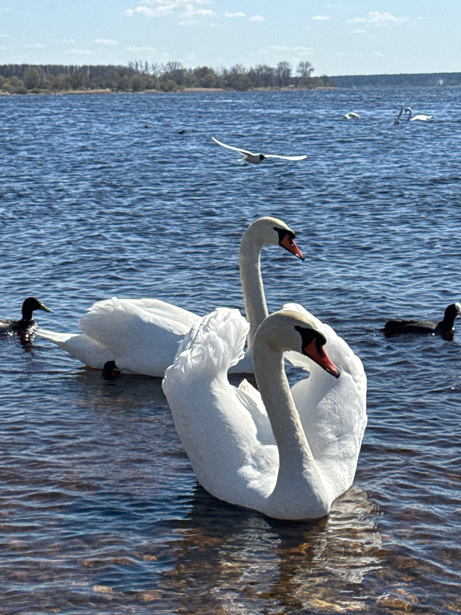 The image shows two white swans in a body of water, likely the Daugava River, which flows through Riga, Latvia. Their necks are intertwined, forming a heart shape. In the background, there's a line ofโฆread more