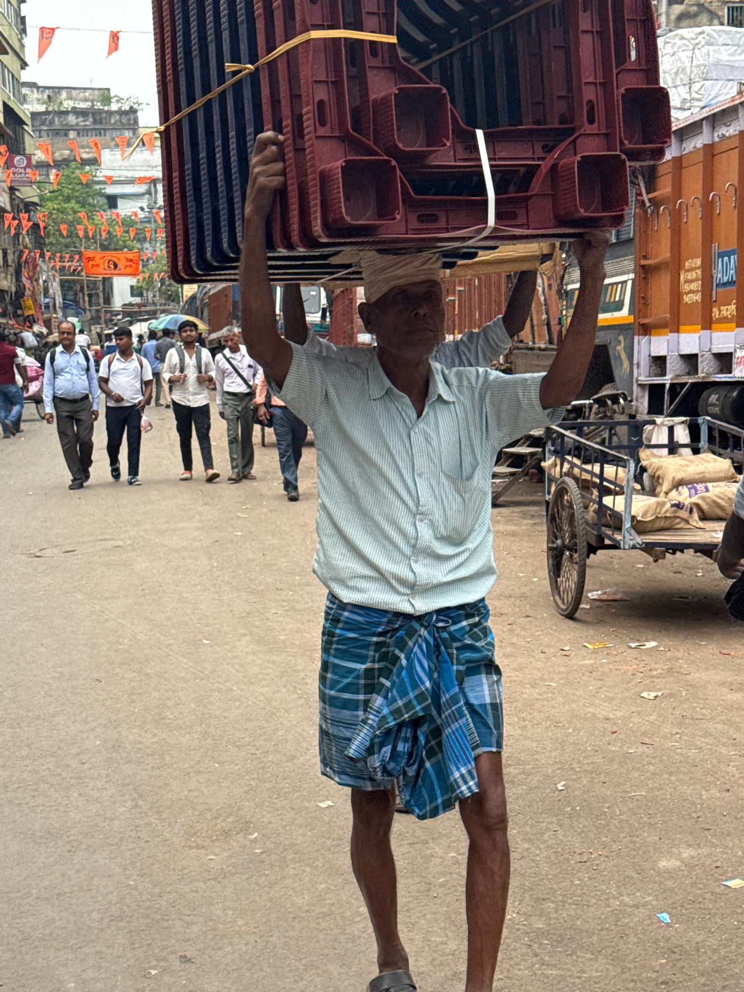 An elderly man in Kolkata, India, is carrying a stack of red crates on his head. He is wearing a light blue striped shirt and a blue and white checkered sarong. A crowd of people, some wearing white s…read more