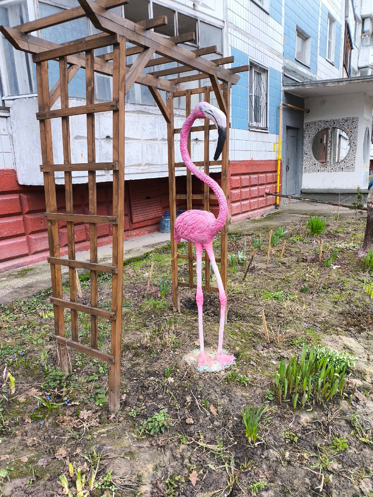 A pink flamingo lawn ornament stands inside a wooden arbor in a garden in Khimki, Russia. A building with a gray entrance and windows with security bars is in the background. The garden has young plan…read more
