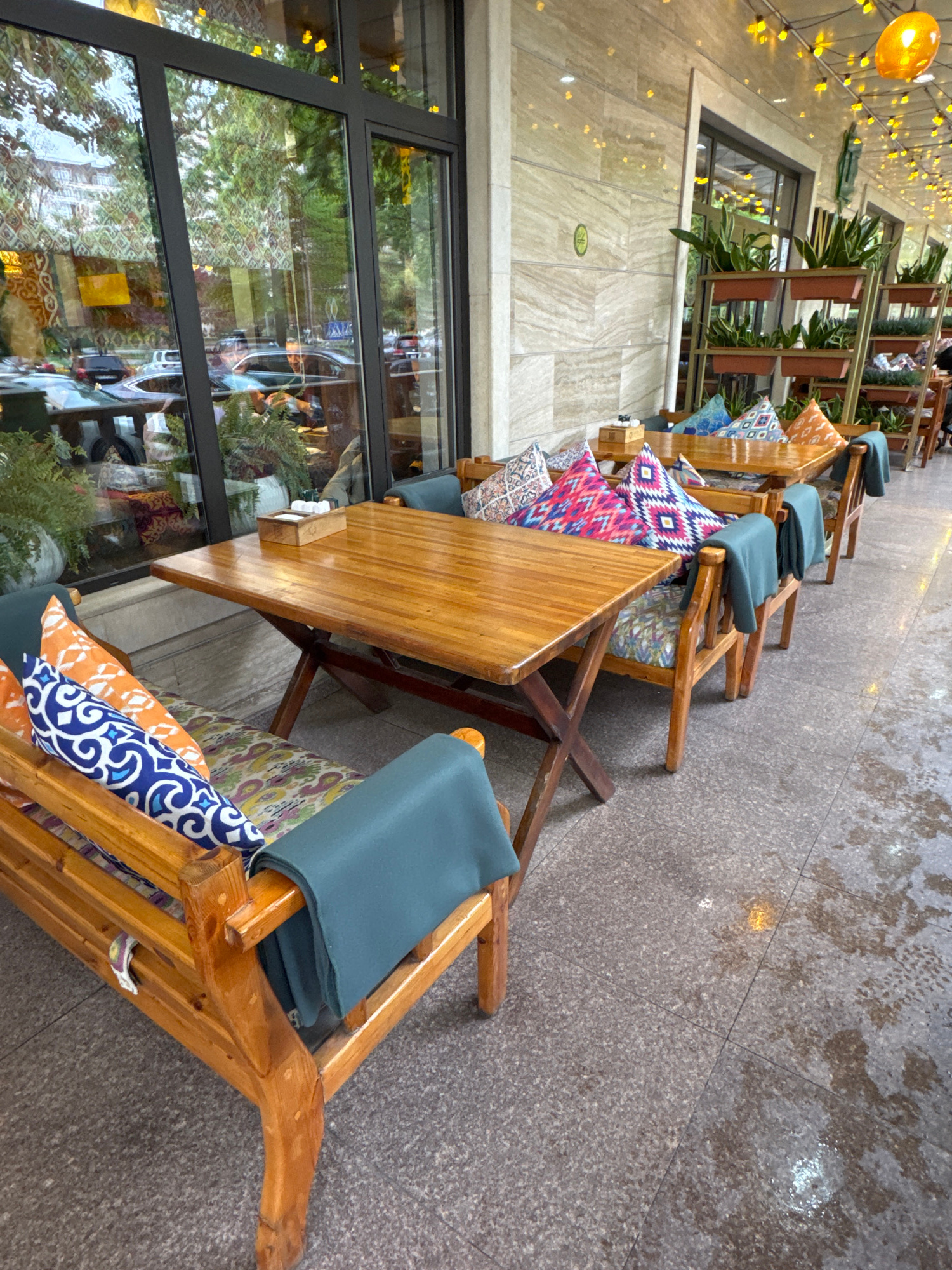 This image presents an outdoor seating area of a cafe or restaurant, likely situated along a sidewalk or promenade in Bishkek City, Kyrgyzstan. The perspective is angled, showcasing a row of wooden taβ¦read more