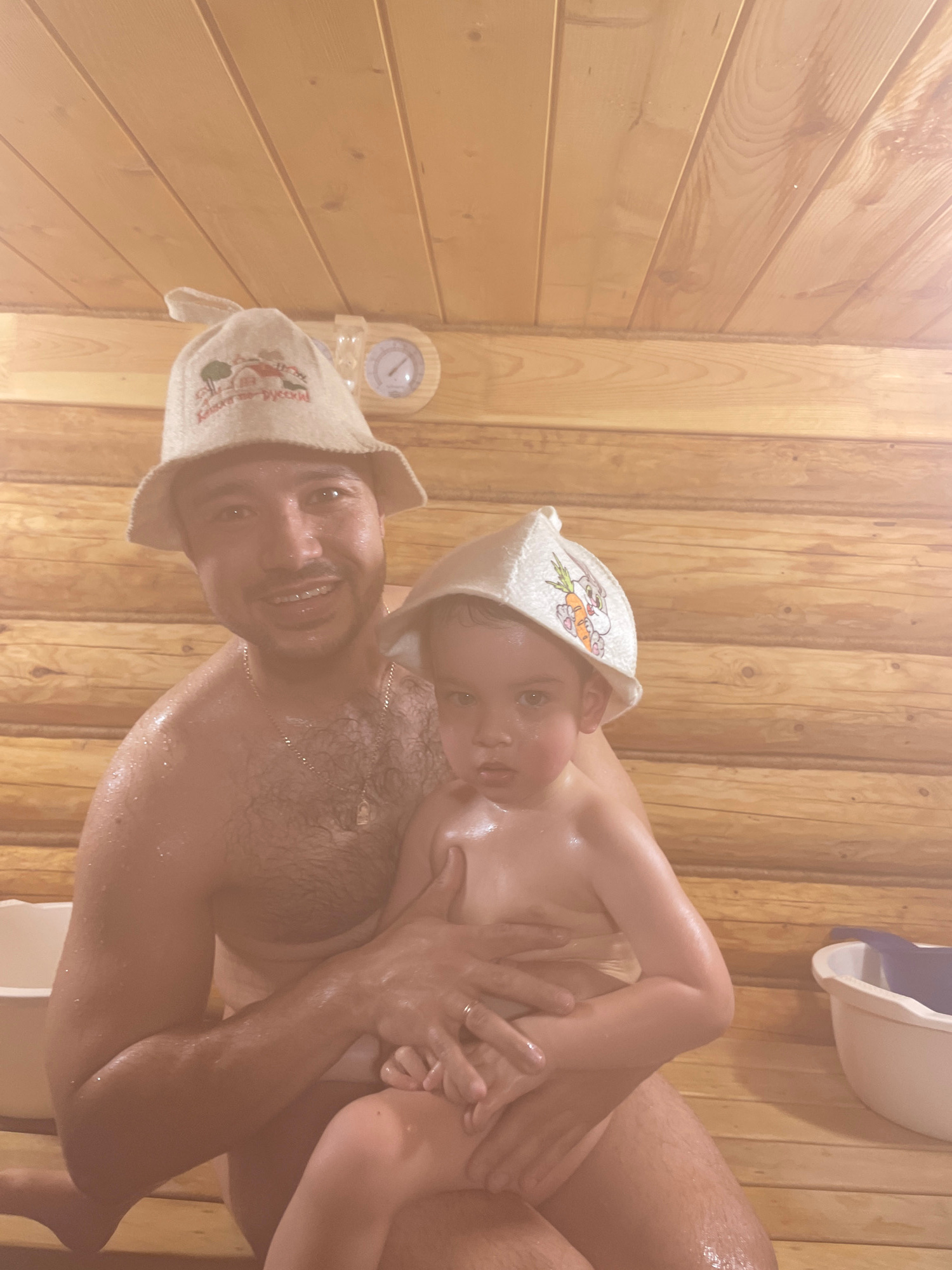 A man and a child, both wearing sauna hats, are in a sauna. The man is holding the child. The walls of the sauna are made of wood. A thermometer is visible on the wall. A white basin is in the upper r…read more