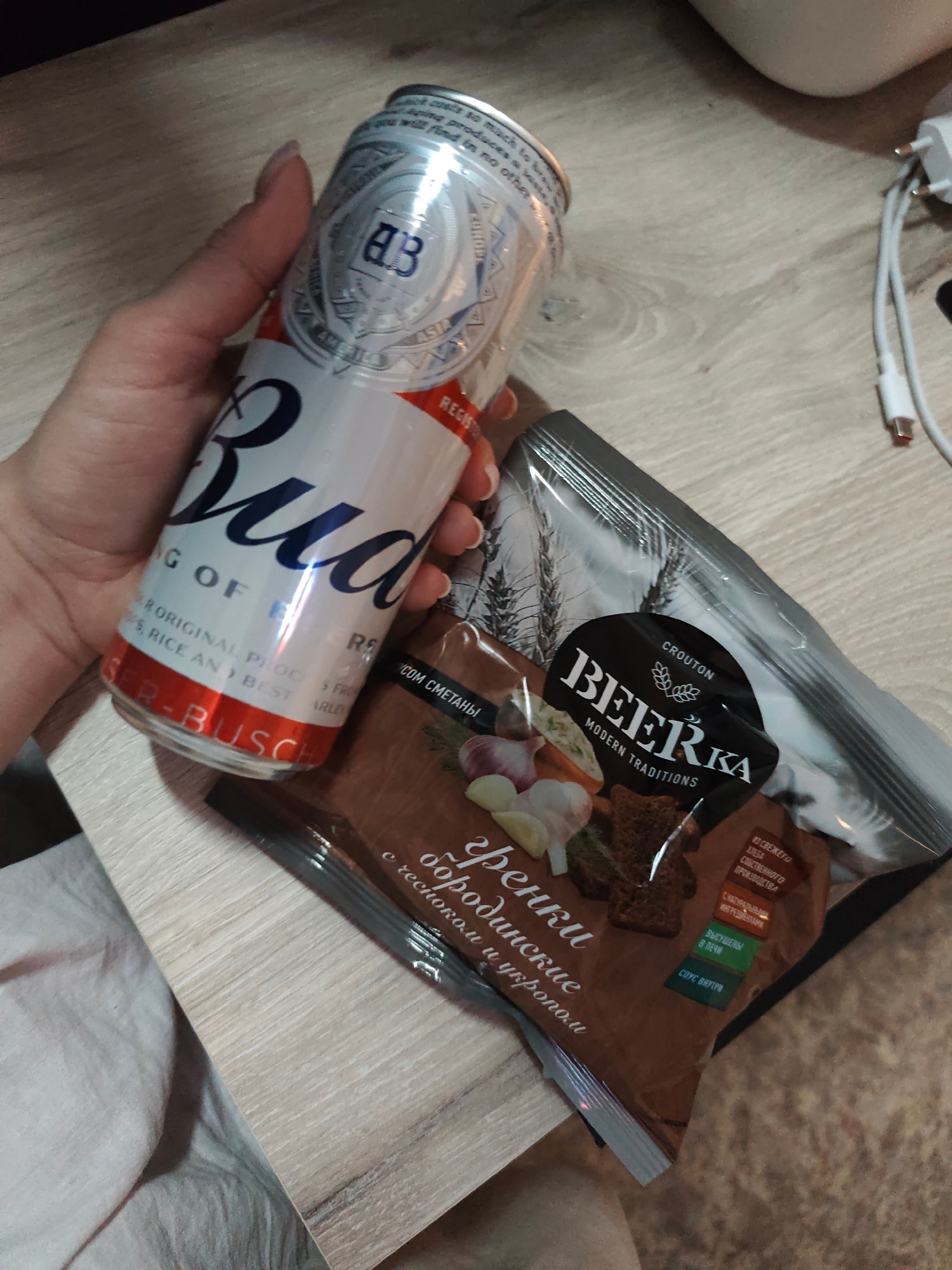 A hand holds a can of Budweiser beer next to a bag of Beerka croutons, borodinsky flavor with garlic and dill. The packaging of the croutons indicates that they are produced in Russia. A portion of a…read more