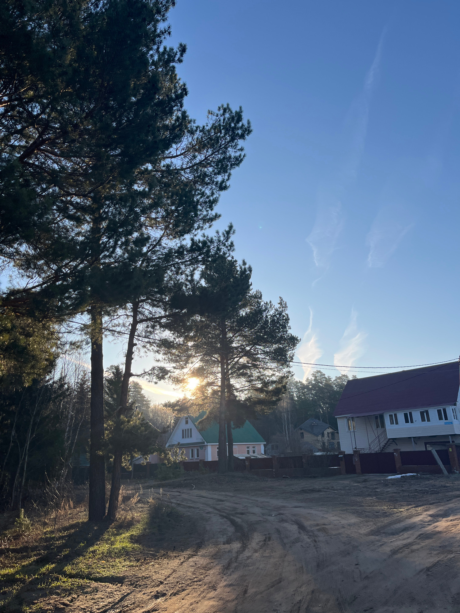 The image shows a dirt road in the city of Chaikovsky, Russia. The road is lined with trees on the left and buildings on the right. The sun is shining through the trees, creating a glare. A large, mul…read more