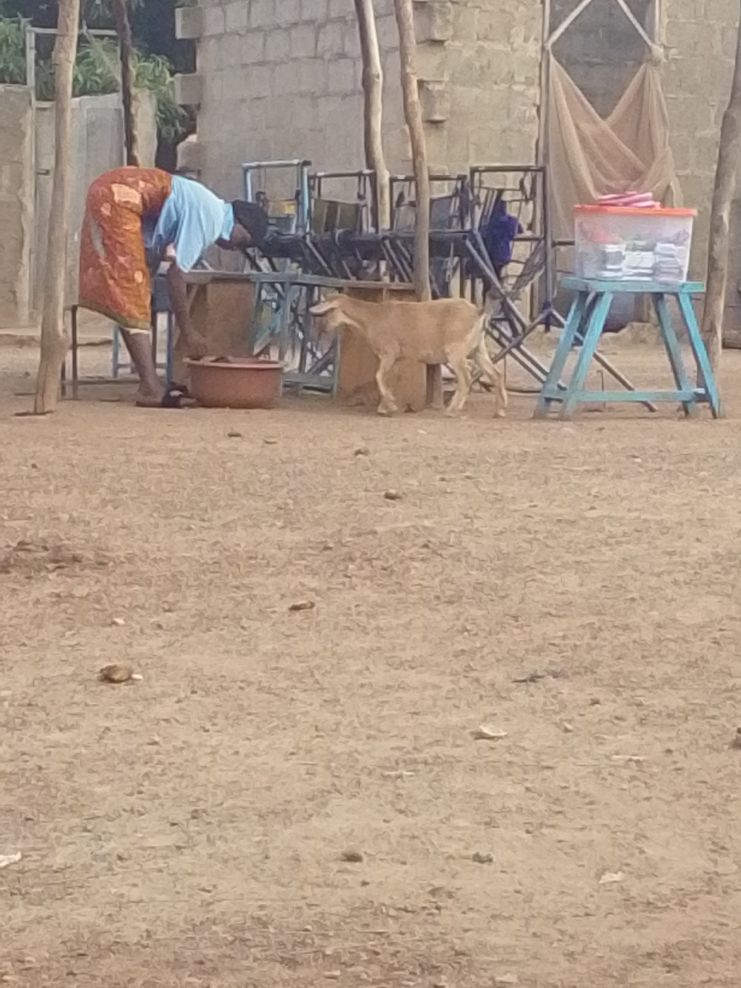 Outside in Tamale, Ghana, a person wearing a blue shirt and patterned orange skirt bends at the waist in front of an opaque metal structure while facing left of the frame. To the right, a light brown…read more