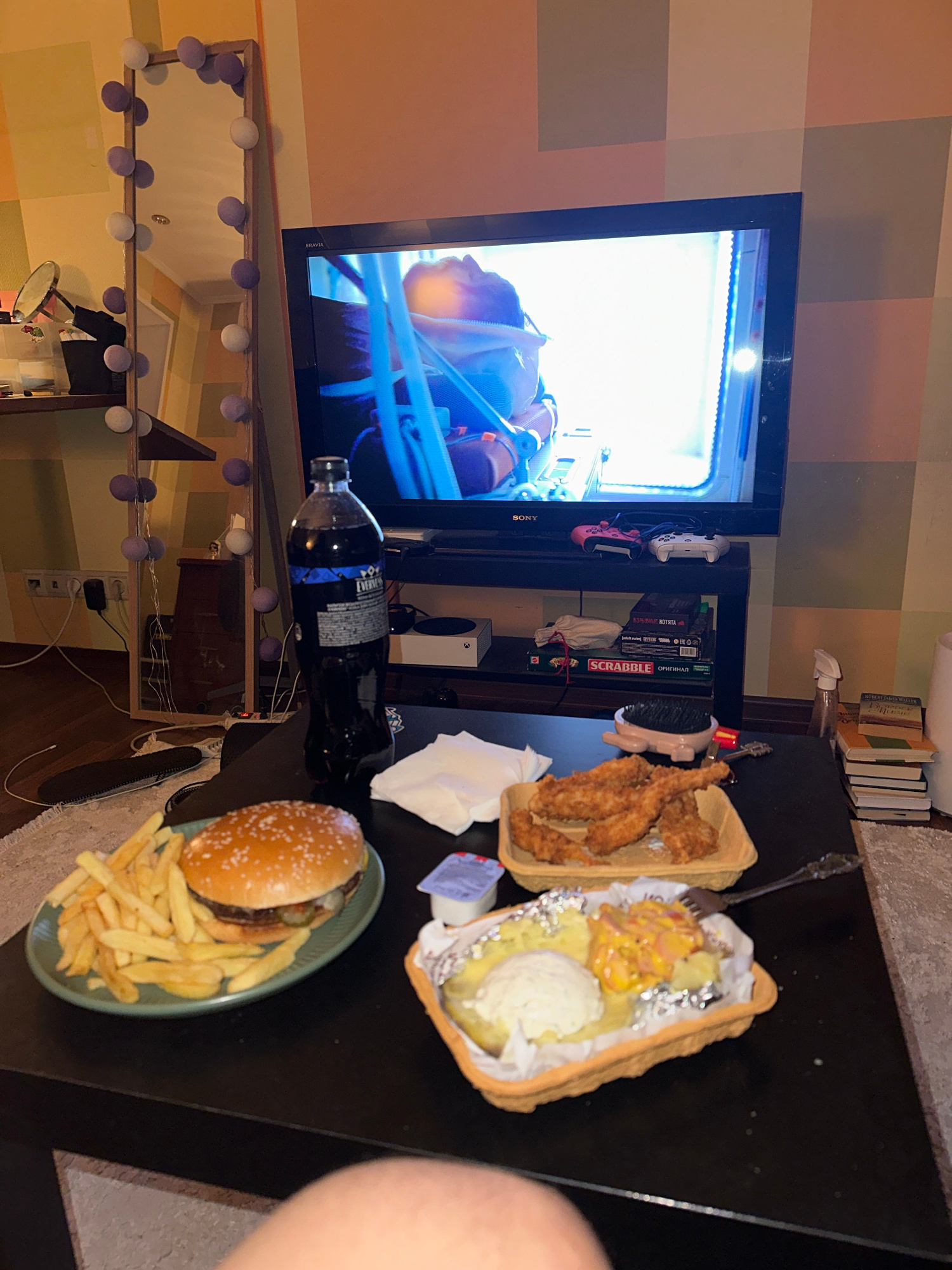 A person is watching television while having fast food. The TV is on a stand with game consoles and a Scrabble game. On a black table in front of the TV, there is a plate with a burger and fries, a co…read more