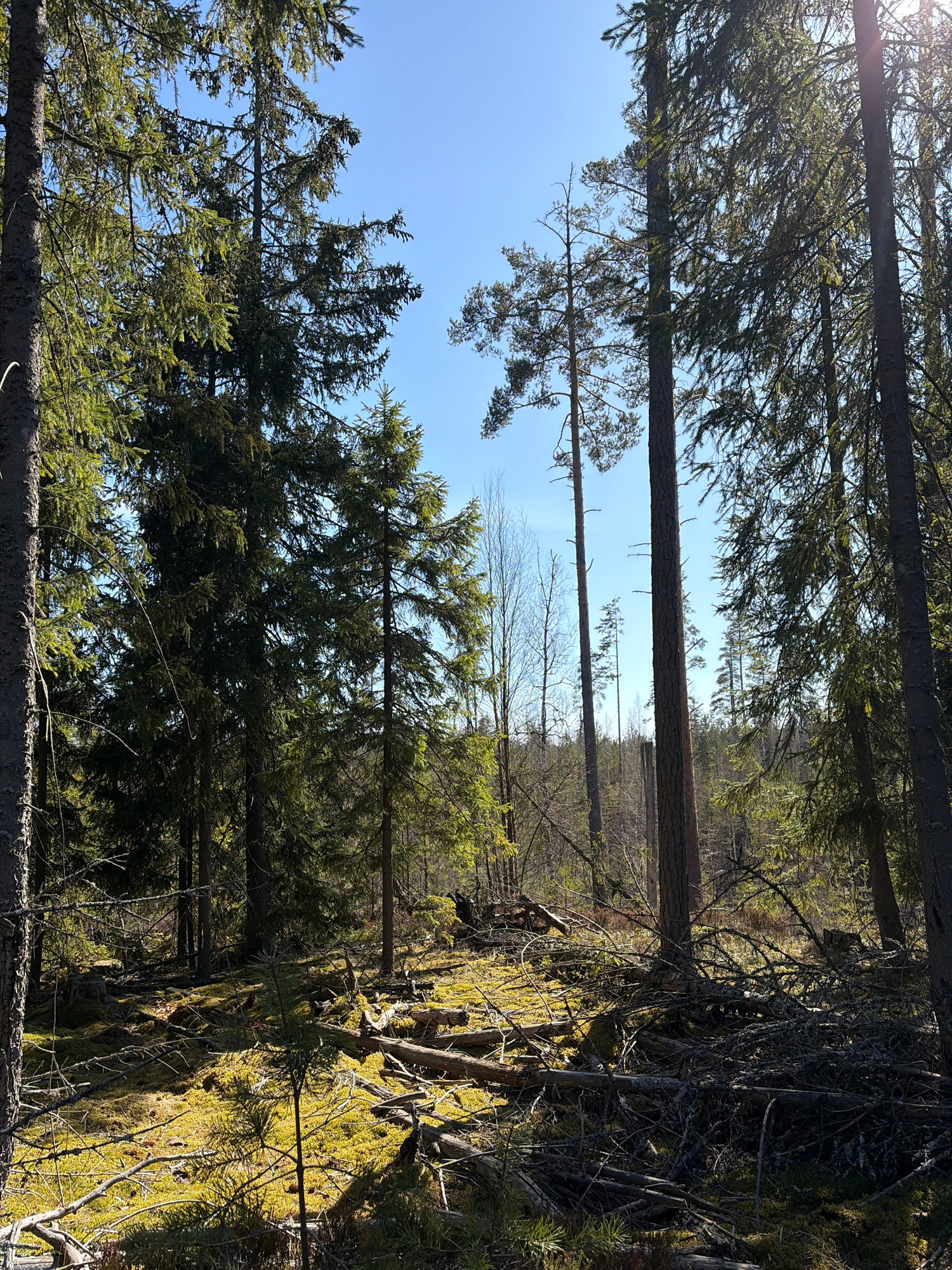 The image depicts a forest scene, possibly located in the Peski area of Russia, given the prompt. The perspective is looking upward through the trees. The trunks of several tall trees are visible, ext…read more