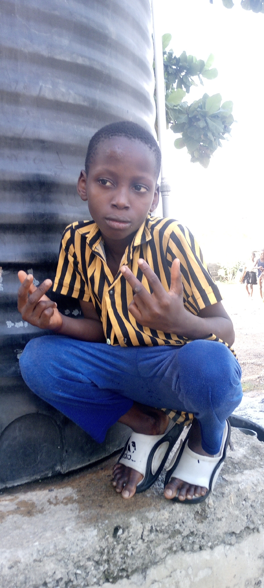In Adankolo, Nigeria, a young dark-skinned boy wearing a yellow and black striped shirt and blue pants is crouched down. He is wearing white and black Adidas sandals. He is making hand gestures, with…read more