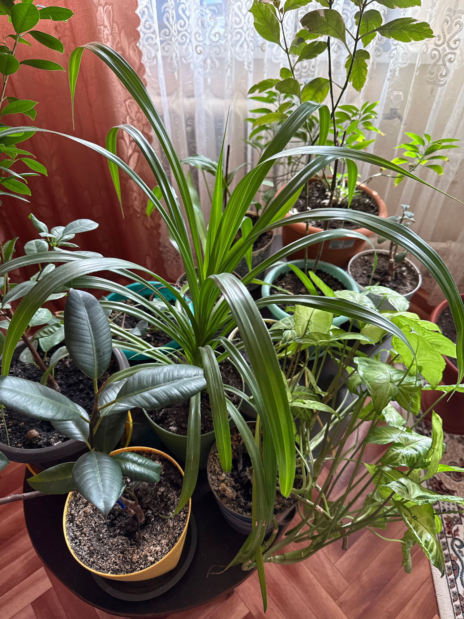 The image depicts a collection of potted houseplants on a dark wooden surface, likely a table or stand, indoors. Various plant species are visible, including what appears to be a type of Dracaena withβ¦read more
