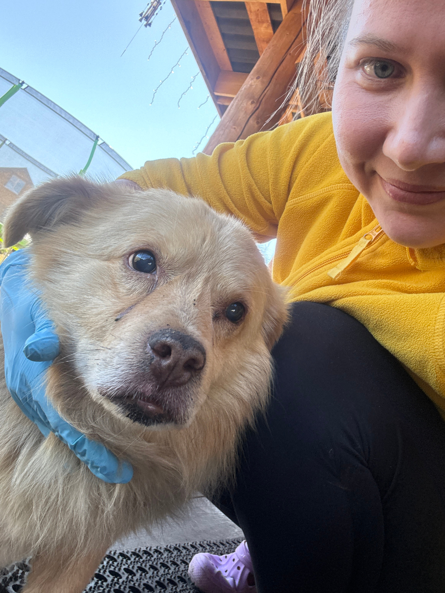 A woman is holding a light-colored, medium-sized dog, looking at the camera. She's wearing a yellow fleece jacket and black leggings. She's also wearing a blue glove. A pair of lilac-colored shoes areβ¦read more