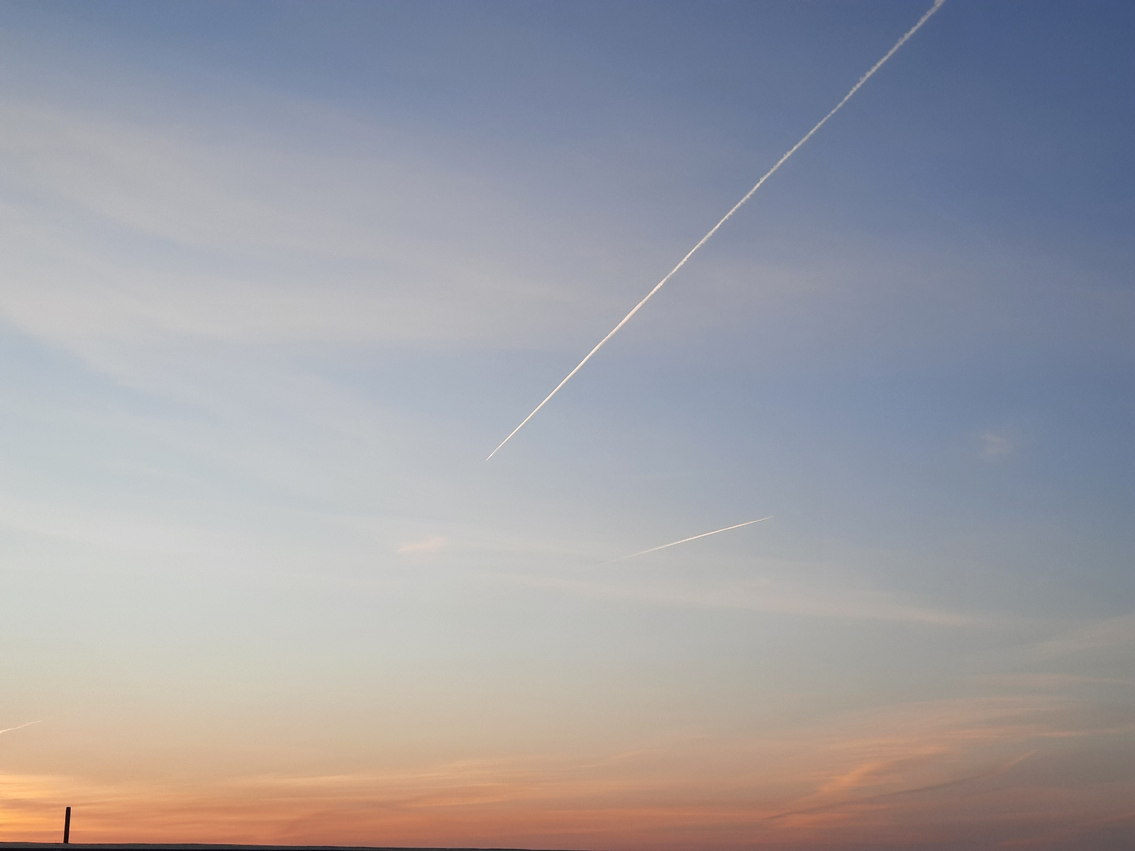 The image shows a sky at dusk or dawn. The sky transitions from a light blue at the top to orange and pink near the horizon. There are two prominent contrails from aircraft visible, one longer and hig…read more