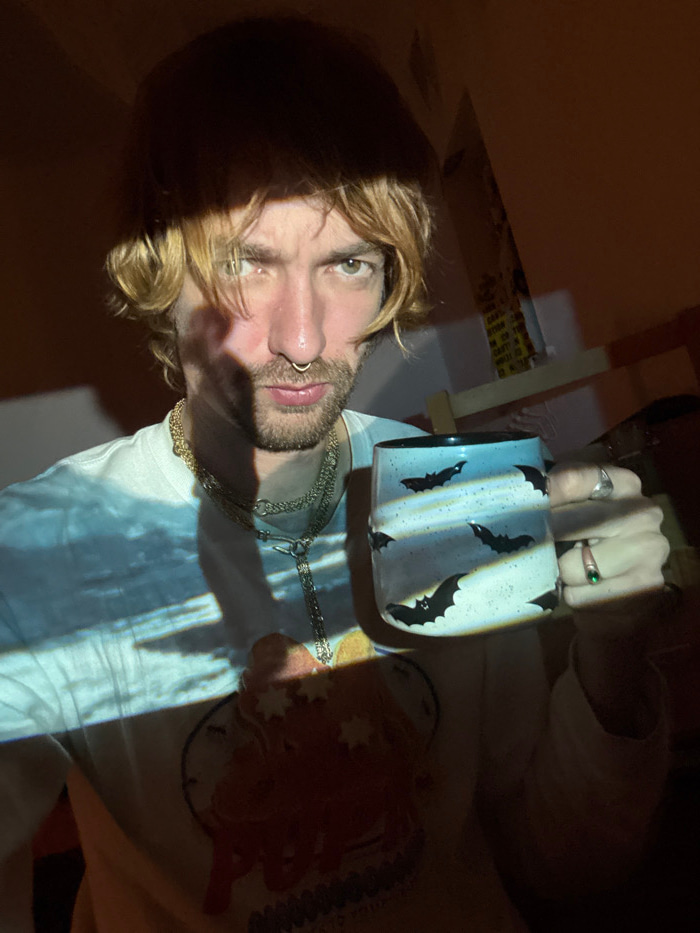 A person with shoulder-length blonde hair and a nose ring holds a mug with bat designs. The person wears a white t-shirt and two layered necklaces. A hand with rings is visible holding the mug. The sc…read more