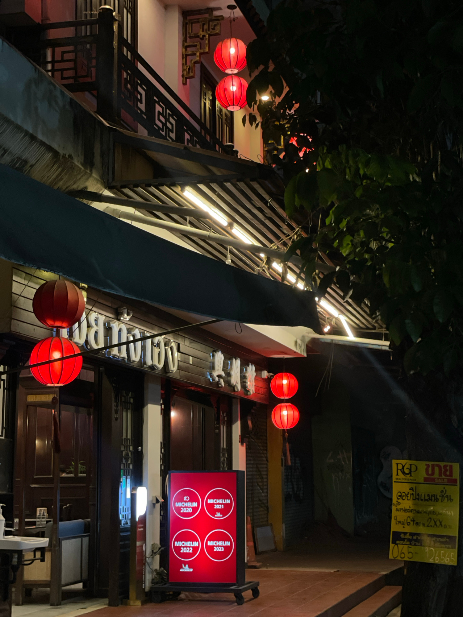 Captured at night in Chiang Mai City Municipality, Thailand, the image presents a street scene with an oriental theme. Red Chinese lanterns cast a warm glow, illuminating the exterior of what appears…read more