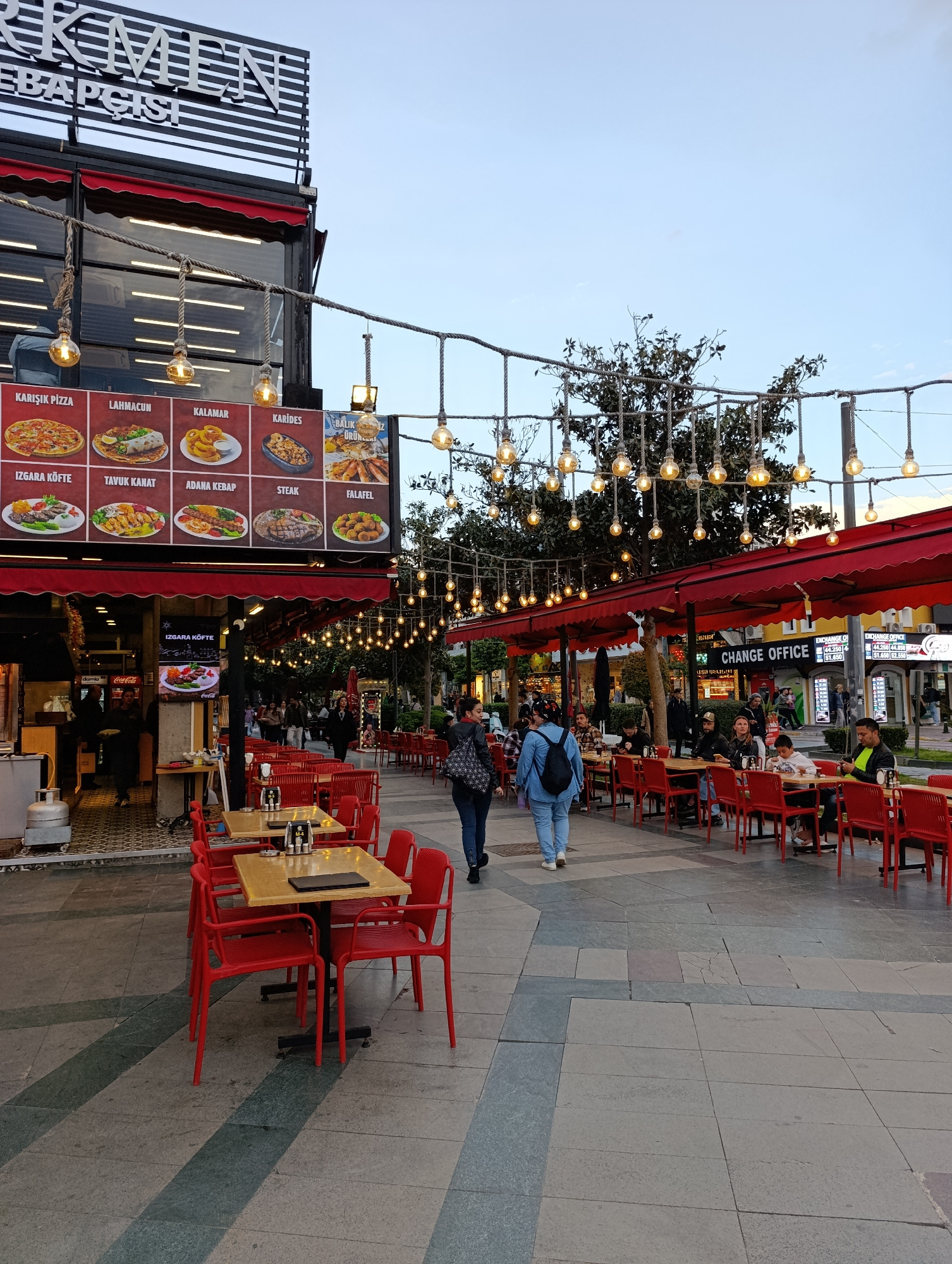 The image shows an outdoor dining area in Antalya, Turkey. Tables and red chairs are arranged along a pedestrianized street. People are seated at some tables, dining. A restaurant with a red awning di…read more