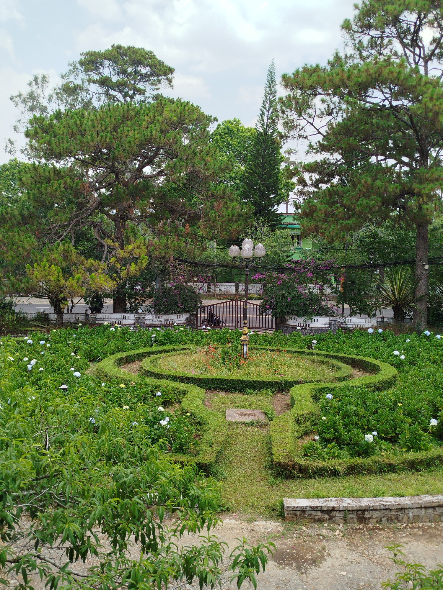 The photograph shows a manicured garden in Da Lat, Vietnam. The garden is laid out in a formal design with low box hedges forming geometric shapes. Hydrangea bushes with white and blue flowers are pla…read more