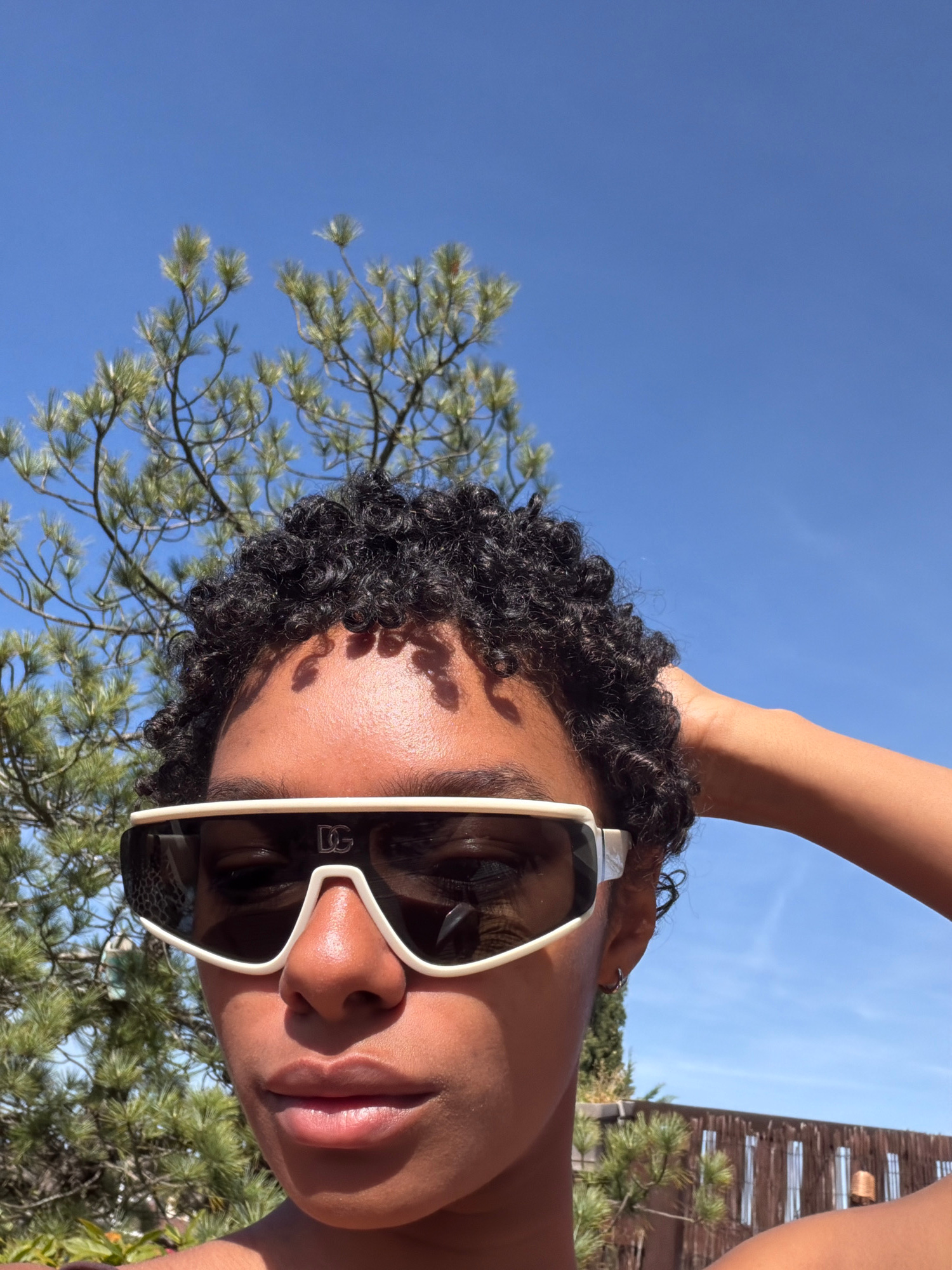 A low-angle, portrait-oriented photograph depicts a person with dark curly hair wearing sunglasses with white frames. The person's right hand is raised and appears to be touching their hair. The backg…read more