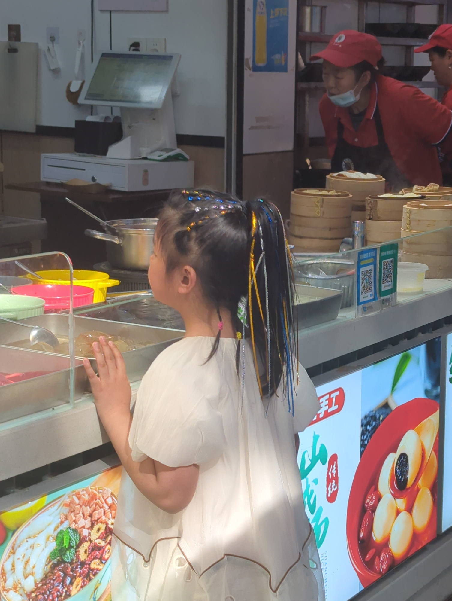 The image depicts an indoor scene within a food establishment, likely a dessert shop or food stall, located in Yuzhong District, China. In the foreground, a young girl, dressed in a white outfit, lean…read more