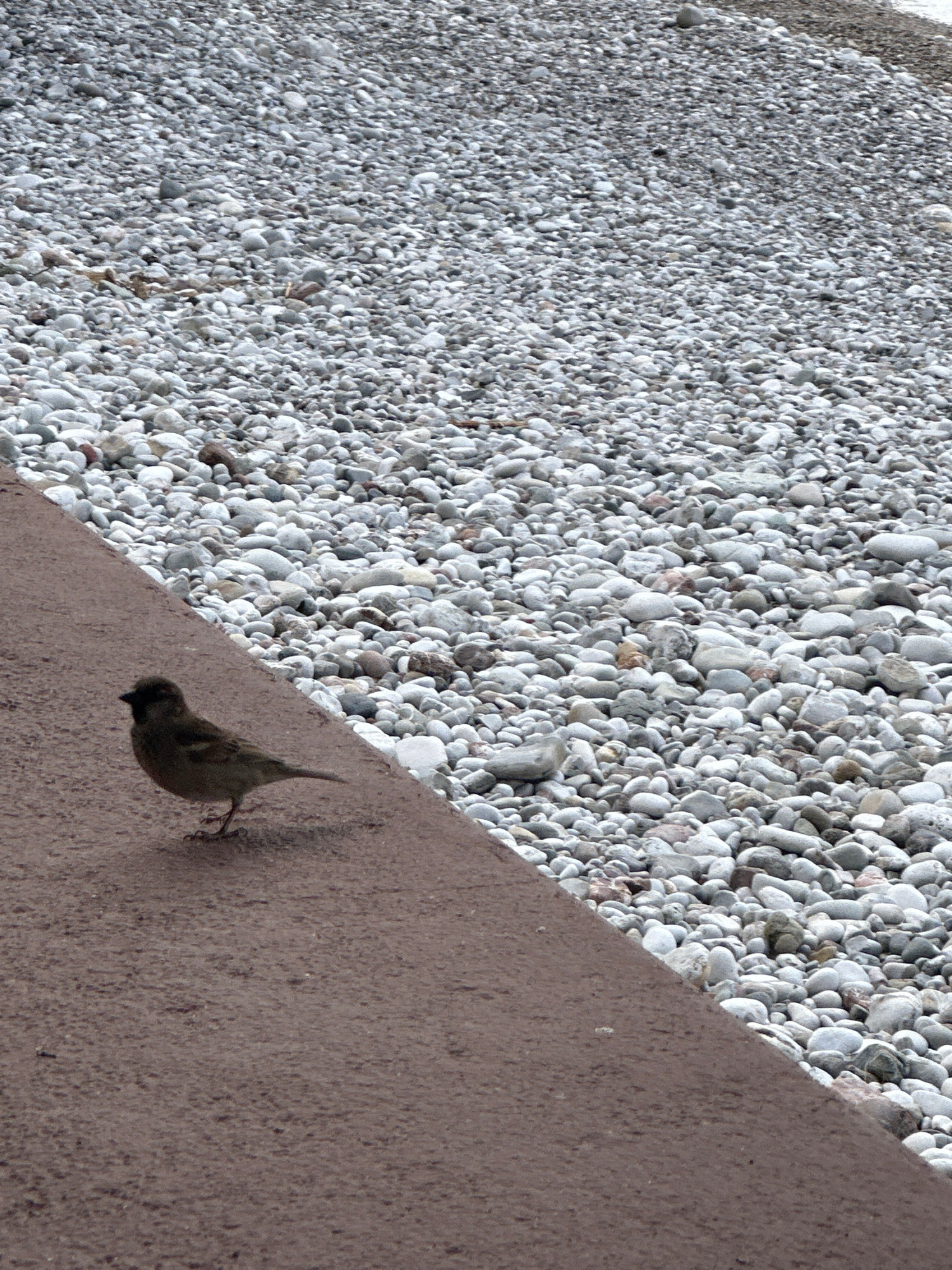 A low-angle, outdoor shot depicts a bird clinging to a brown concrete wall. The upper left portion of the frame is filled with a dense layer of small, white and grey pebbles. The wall diagonally bisec…read more