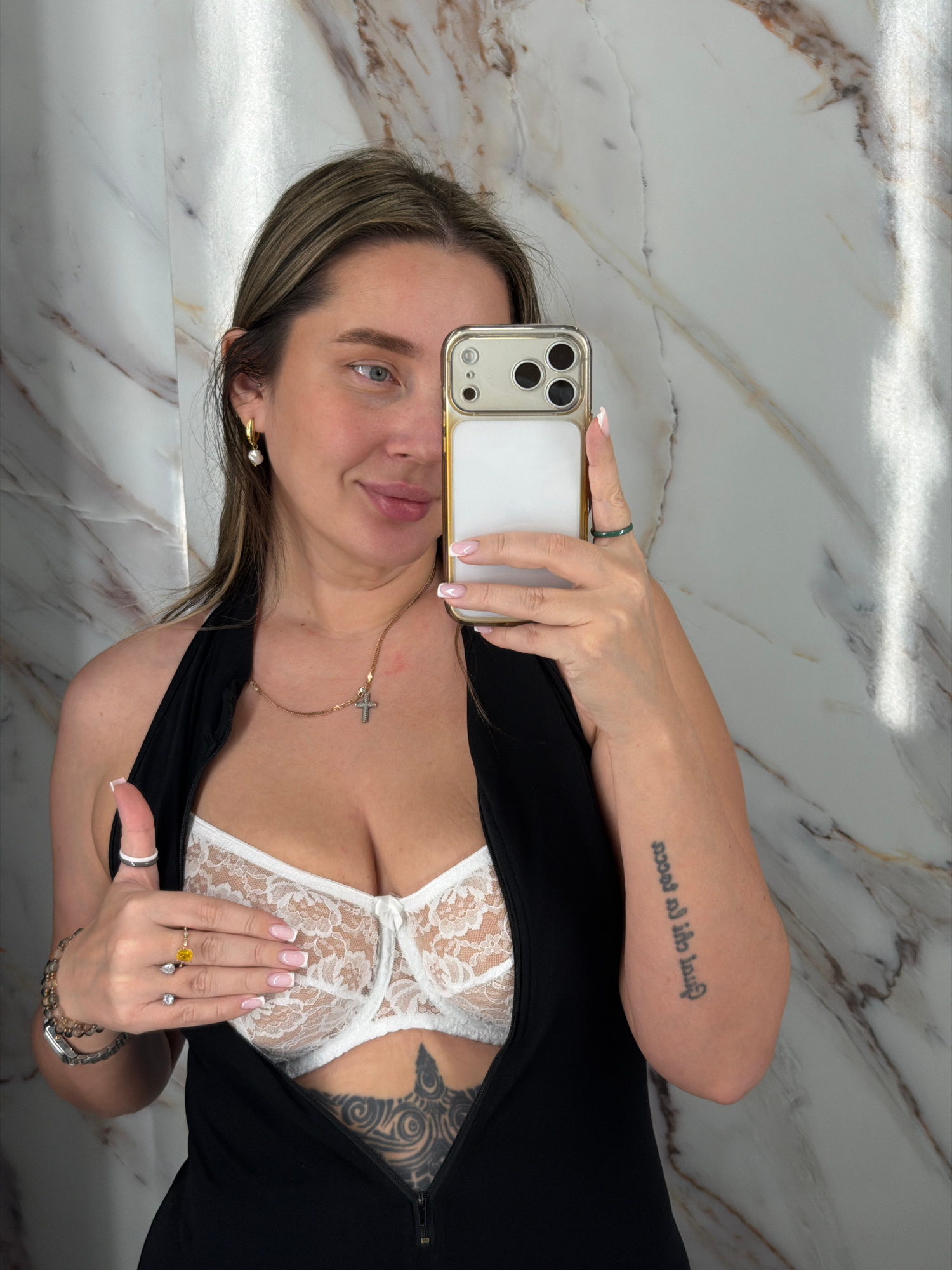 A woman is posing for a selfie in front of a marble-patterned wall. She is holding a smartphone with a gold-colored case in her left hand, partially obscuring her face. She has blonde hair with highli…read more