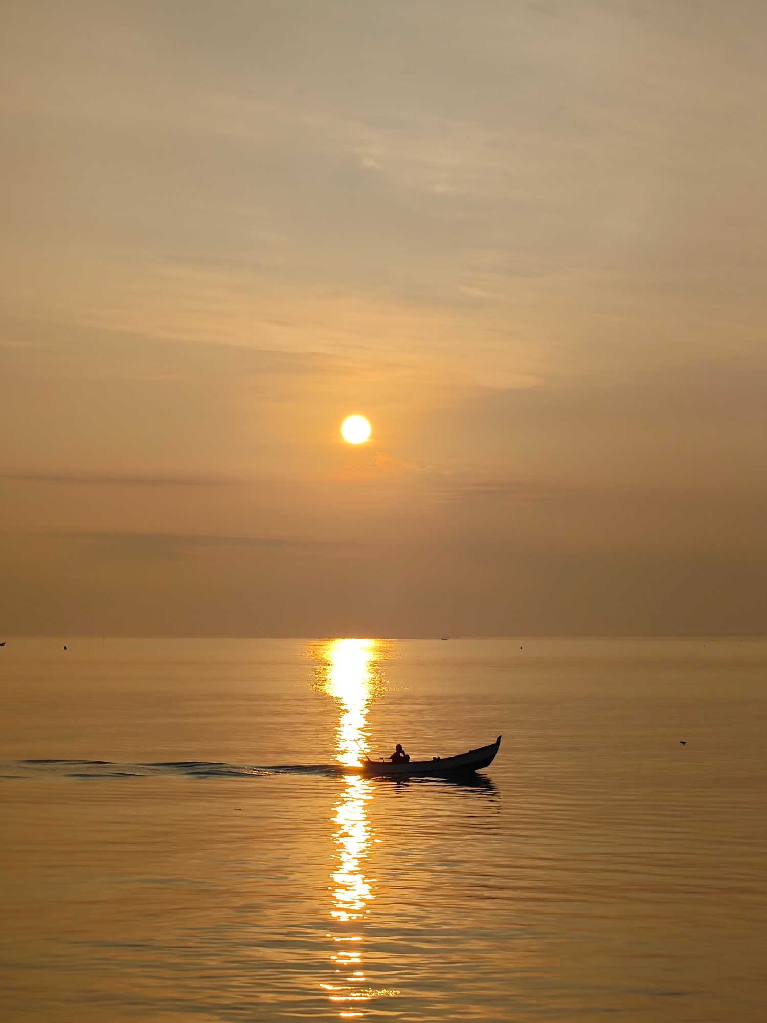 The image captures a serene sunset scene, likely taken in Lhokseumawe, Indonesia, due to the prompt context. A single person is seated in a small boat gliding across the water. The setting sun casts a…read more