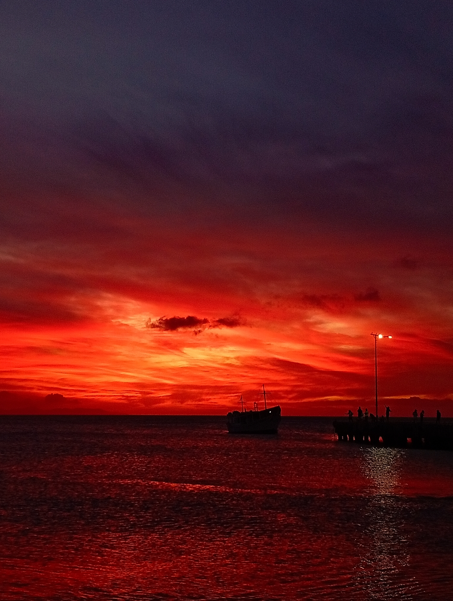 The image displays a dusk scene in Juan Griego, Venezuela. The sky transitions from a deep purple-blue at the top to a vibrant, intense red and orange across the middle and lower sections, featuring d…read more