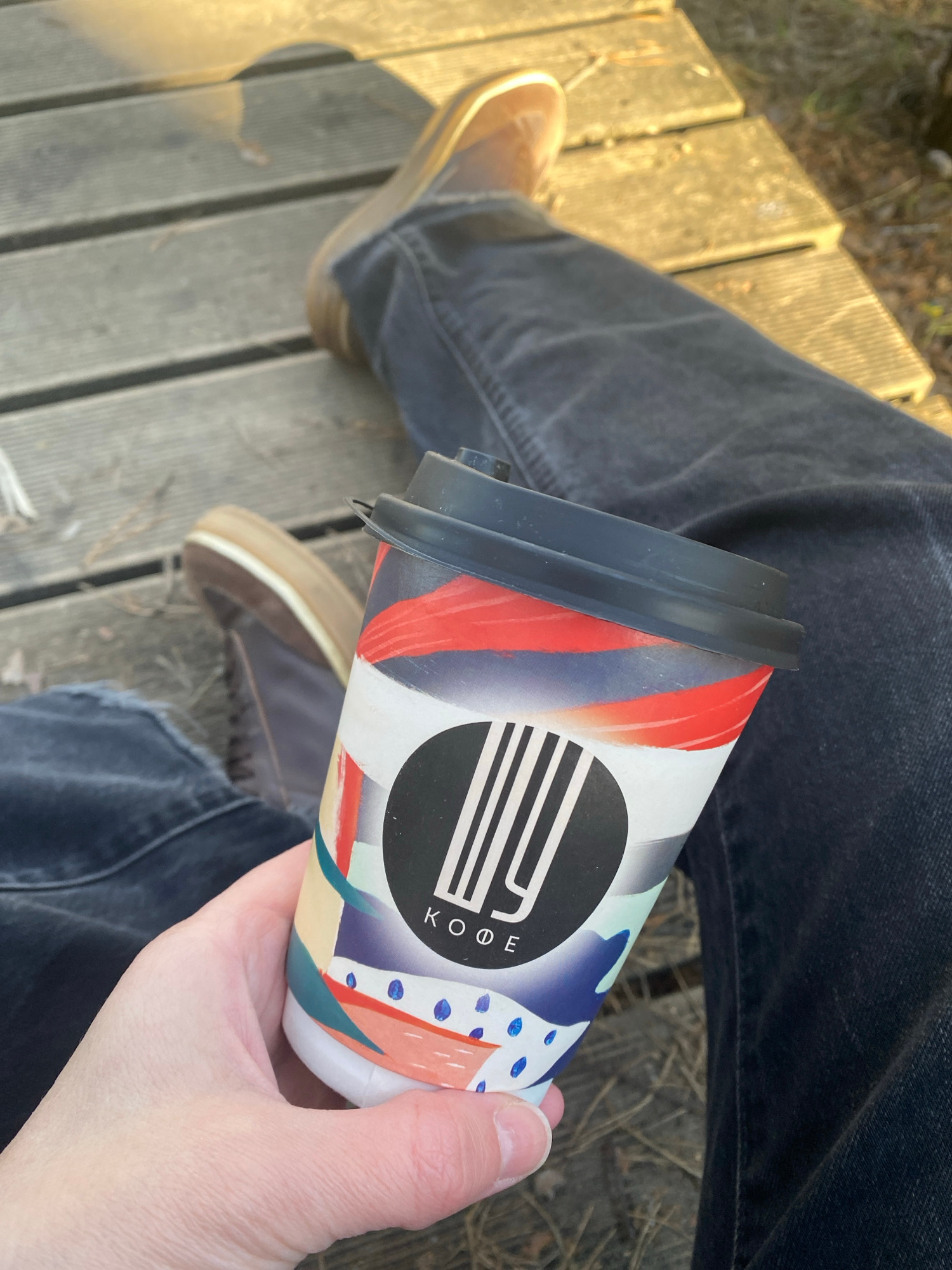 A person is sitting on a wooden deck, holding a paper coffee cup in their right hand. The cup has a black lid and is decorated with abstract patterns and the word "KODE" in Cyrillic. The person is wea…read more