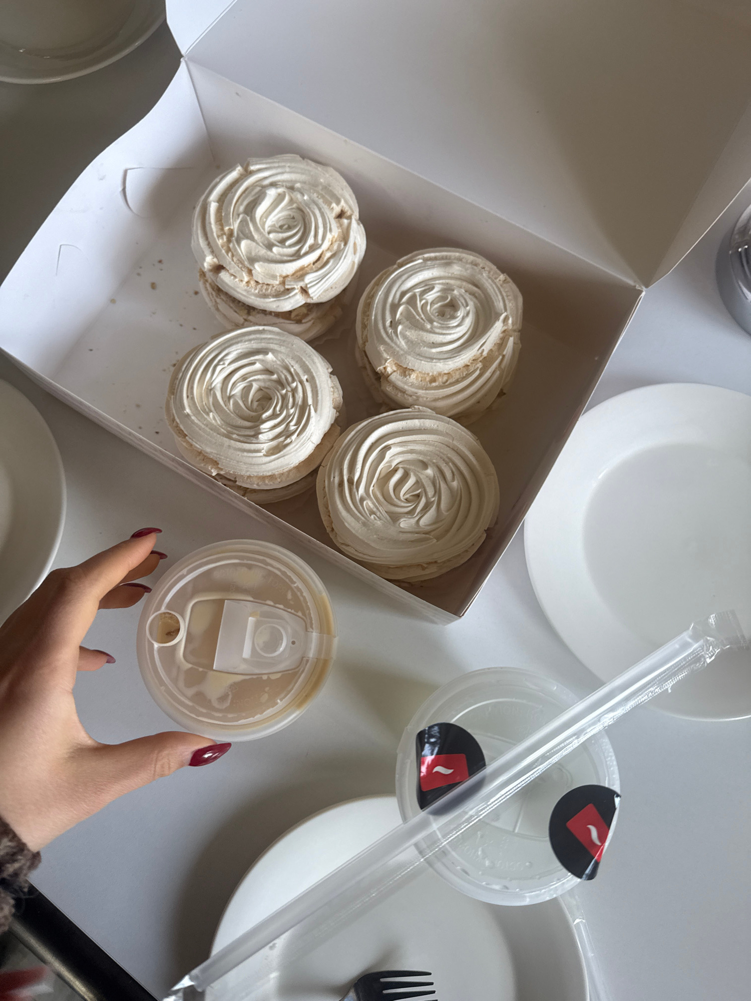 The image is a high-angle shot of a table setting featuring a box of meringues and beverages. A white cardboard box contains five meringues arranged in two rows. To the right of the box are several wh…read more