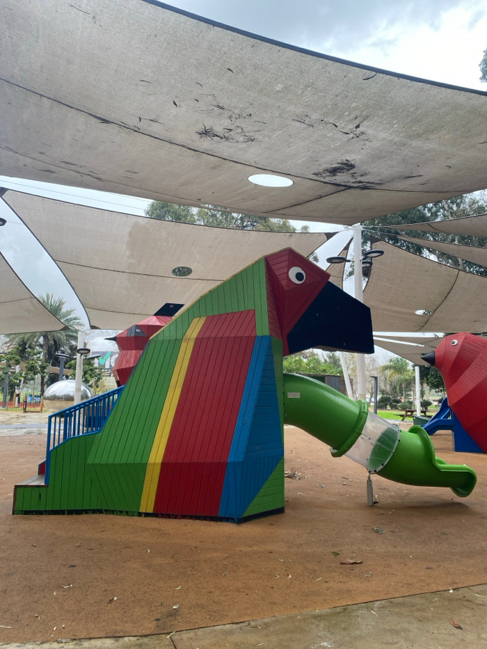 The image displays an unoccupied playground area in Gan Ha'Ir Park (Rabin Square Garden), Tel-Aviv, Israel, under an overcast sky. The primary subject is a large, geometrically stylized play structure resembling a parrot, constructed from vertical wooden planks painted in blocks of green, red, yellow, and blue. The parrot's head is red, featuring a black beak and a white eye with a black pupil. A blue-railed staircase ascends the left side of the structure, while a curved green tubular slide, partially transparent, exits from the right side and terminates on the ground. The ground surface consists of a reddish-brown, possibly rubberized, safety material, with scattered leaves and minor debris. Overhead, multiple large, off-white triangular shade sails are tensioned, exhibiting surface dirt, dark smudges, and leaf litter. These sails are supported by white poles, one of which is visible in the mid-background. To the right of the main structure, a portion of a second, large red bird-shaped play structure is visible. The background reveals additional park elements, including trees (some palm trees), modern light fixtures, a reflective spherical object, and a distant wooden picnic table with benches. No people are present in the scene. | Open Wire