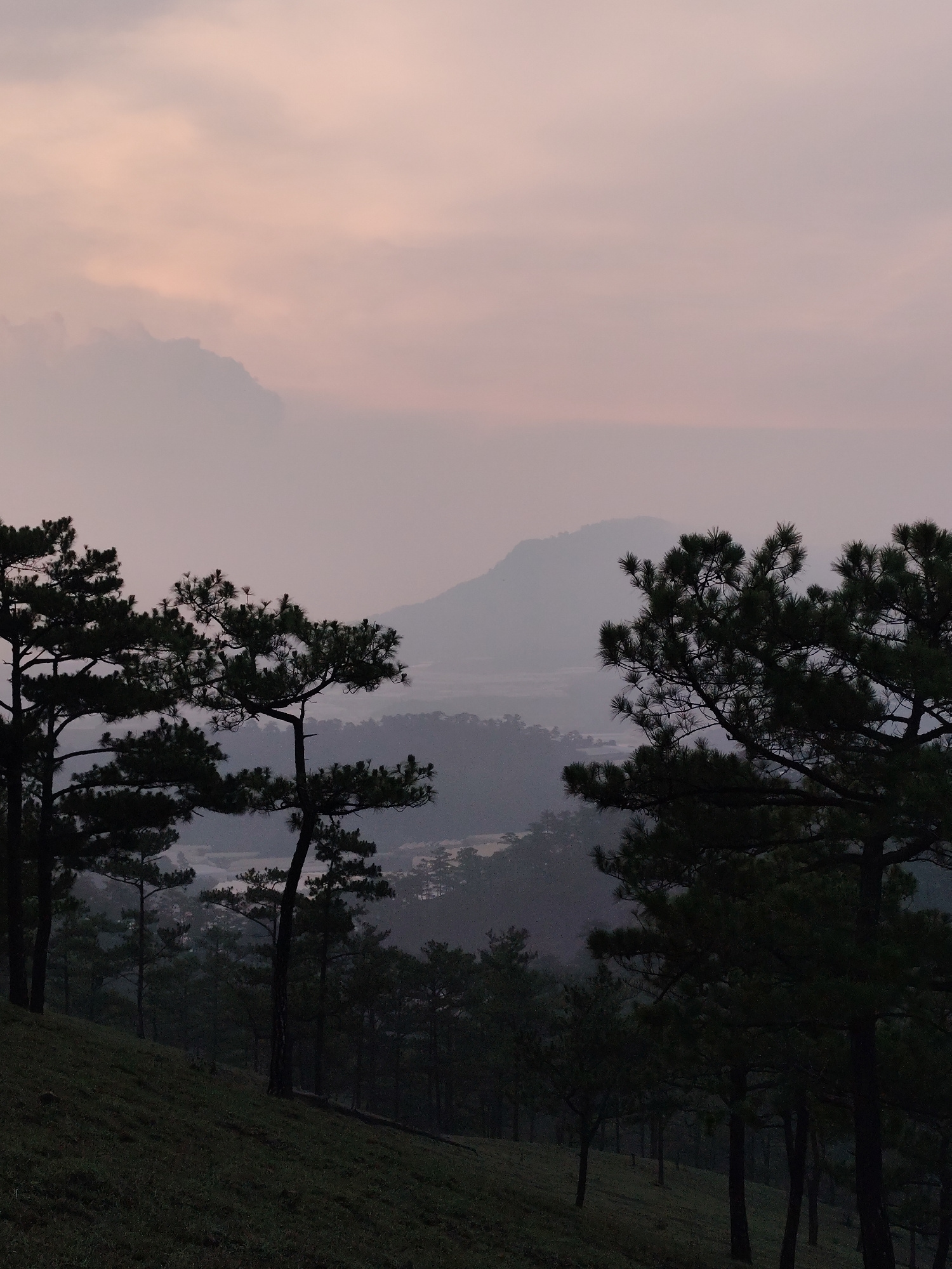 The image presents a serene and atmospheric mountainous landscape, likely captured at either dawn or dusk, in Lạc Dương, Vietnam. The scene is dominated by layers of mist and soft, diffused light, cre…read more