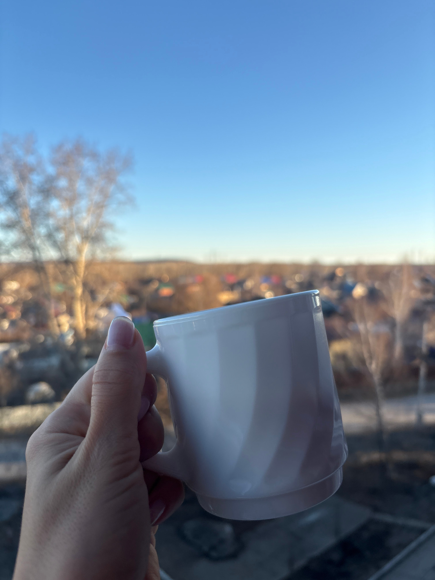 A hand holds a white mug against the background of a blurred cityscape. The sky is clear blue, visible to the left of the mug, and leafless trees are in the middle distance. The city buildings in the…read more